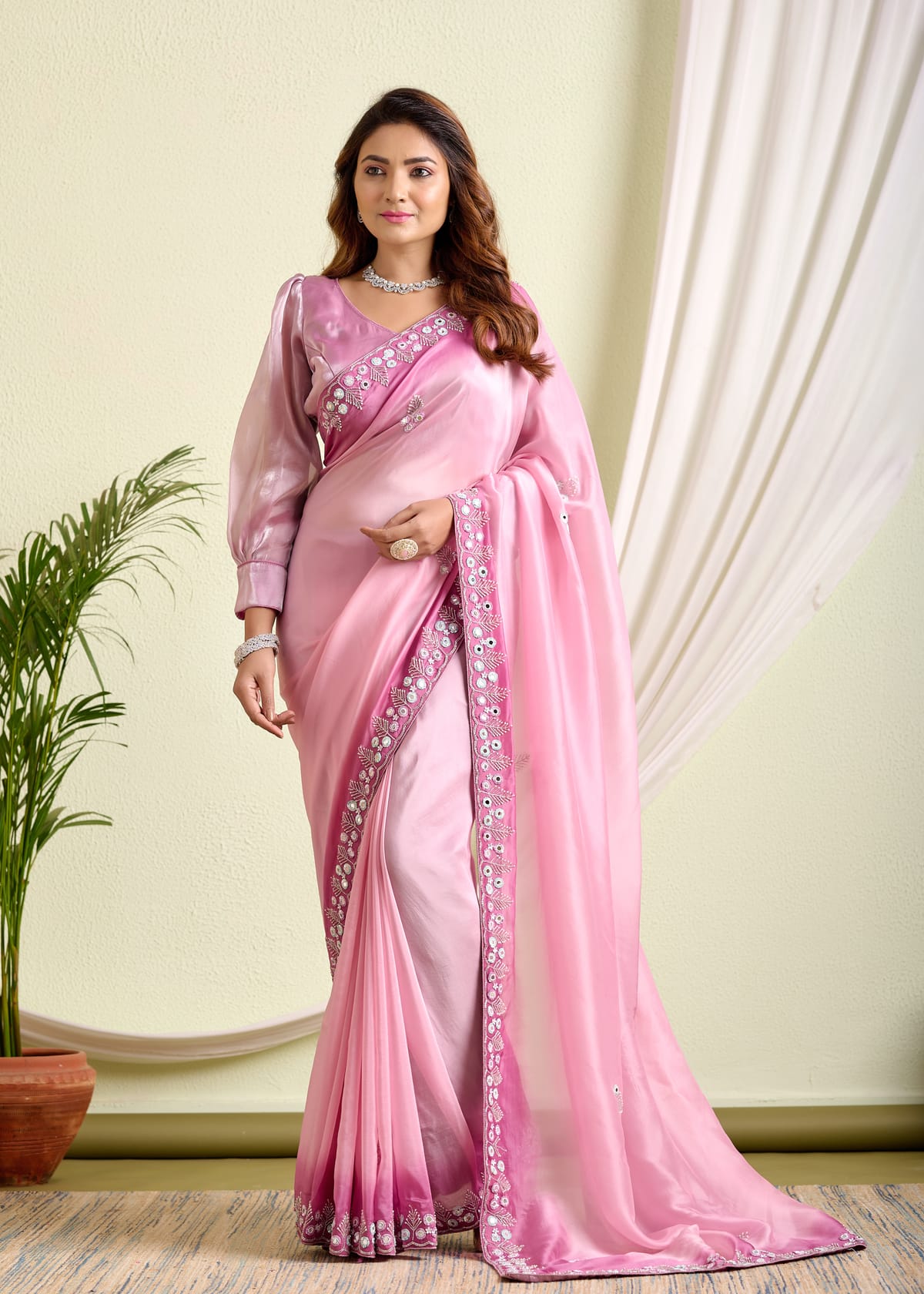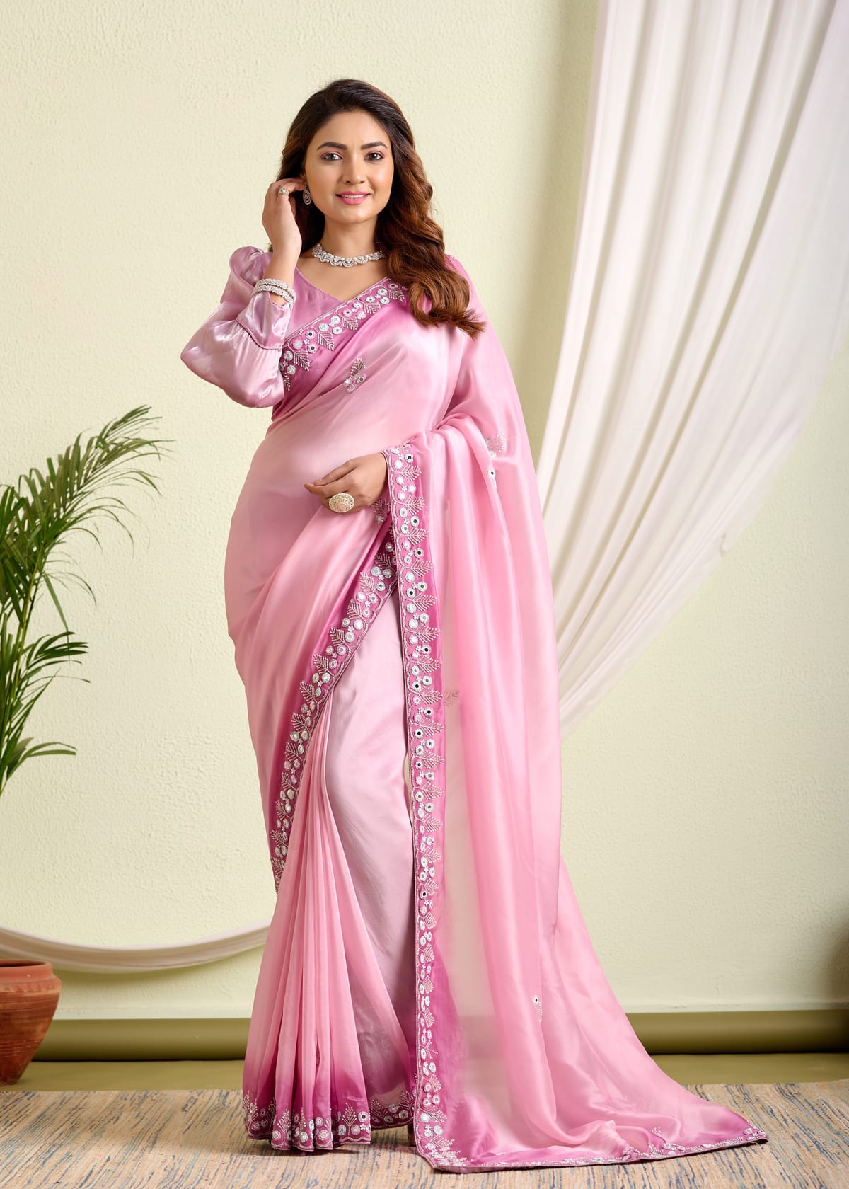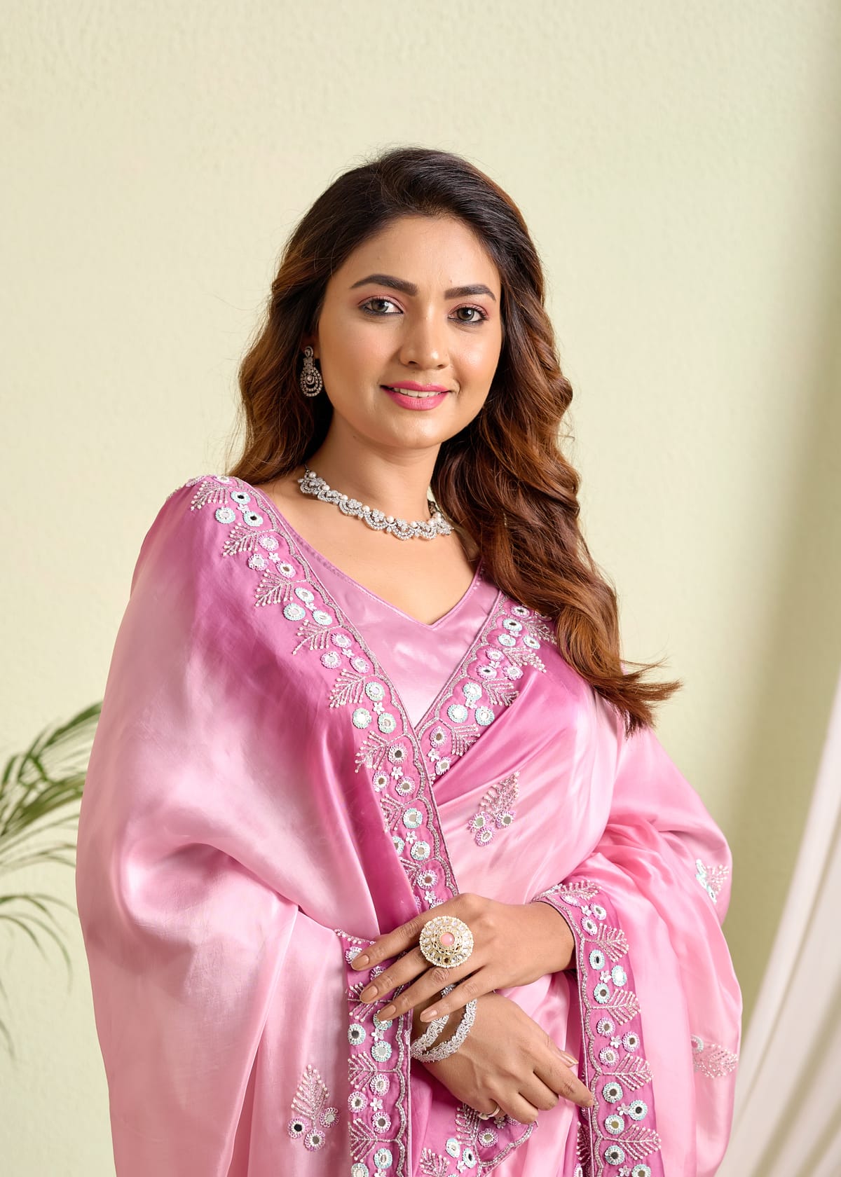 The standout feature is its floral embroidered border highlighted with delicate mirror work and thread detailing in silver and white, adding just the right amount of sparkle to the serene pink canvas. Small, dainty motifs are tastefully scattered across the body, creating a balanced, understated elegance.