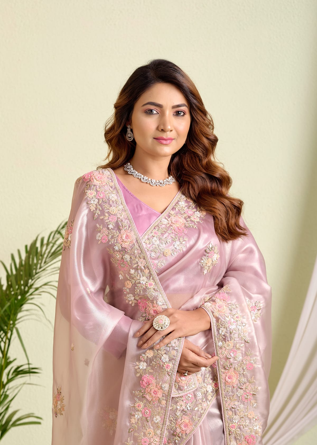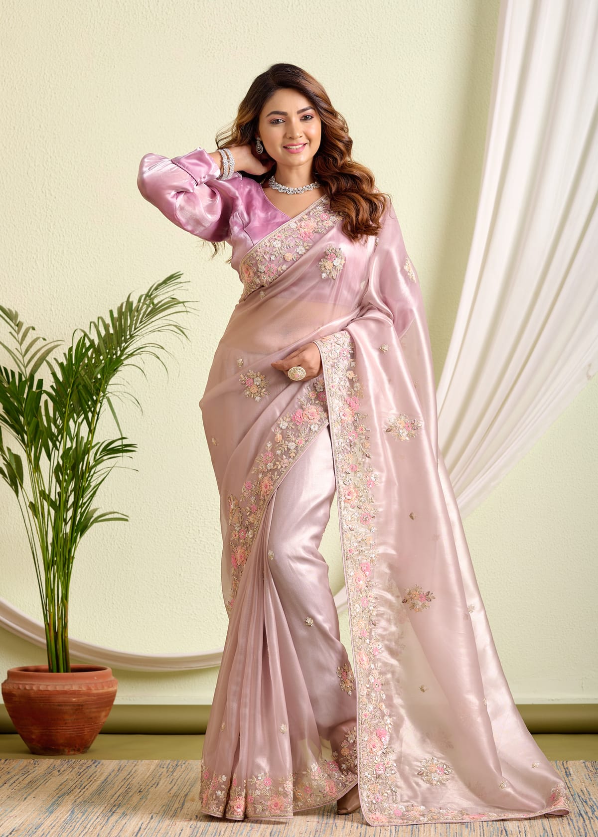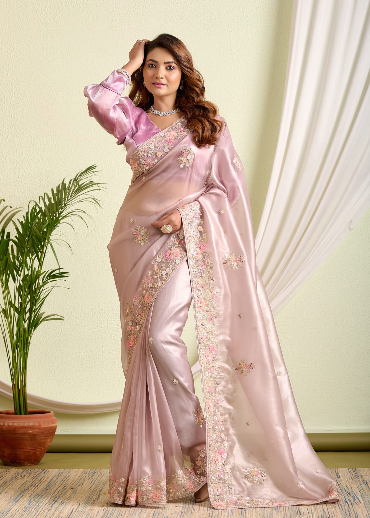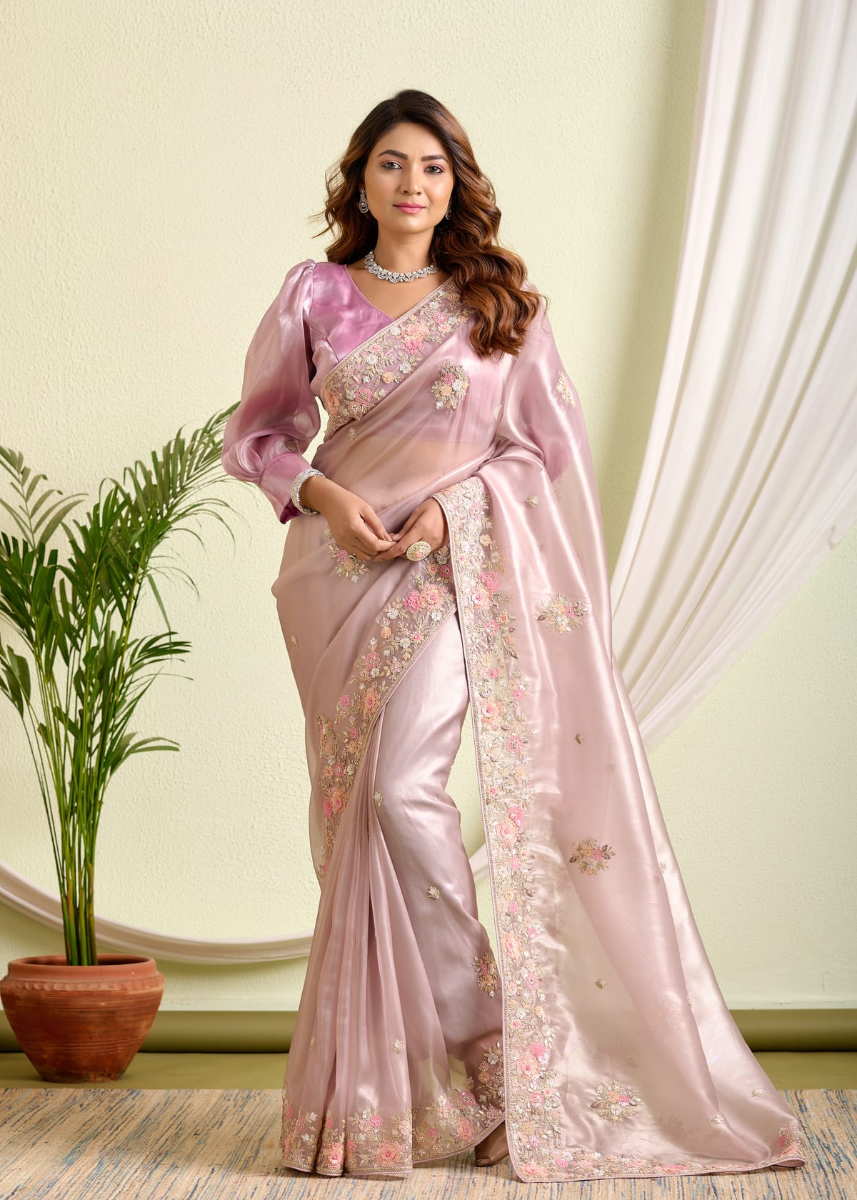 Grace meets glamour in this stunning blush pink tissue silk saree, designed to capture hearts with its ethereal sheen and intricate detailing. Crafted from premium tissue silk, this saree offers a light, airy drape that feels as luxurious as it looks.