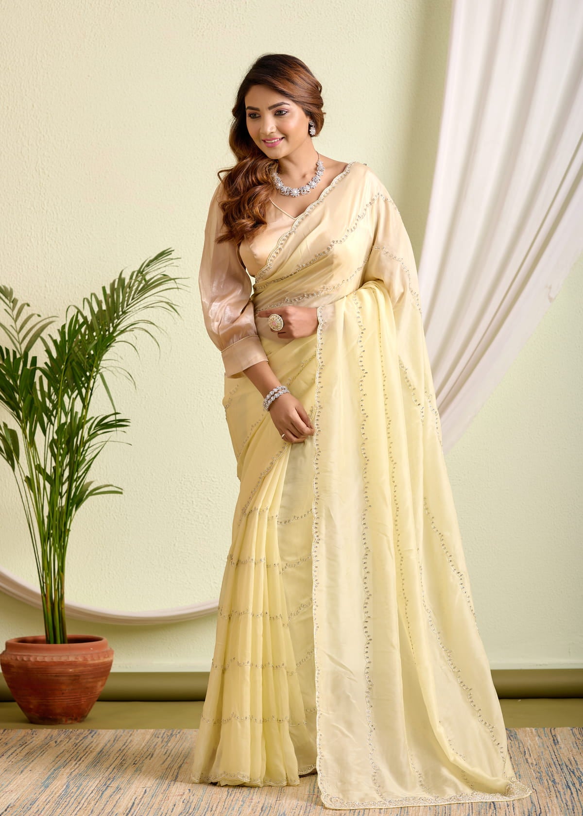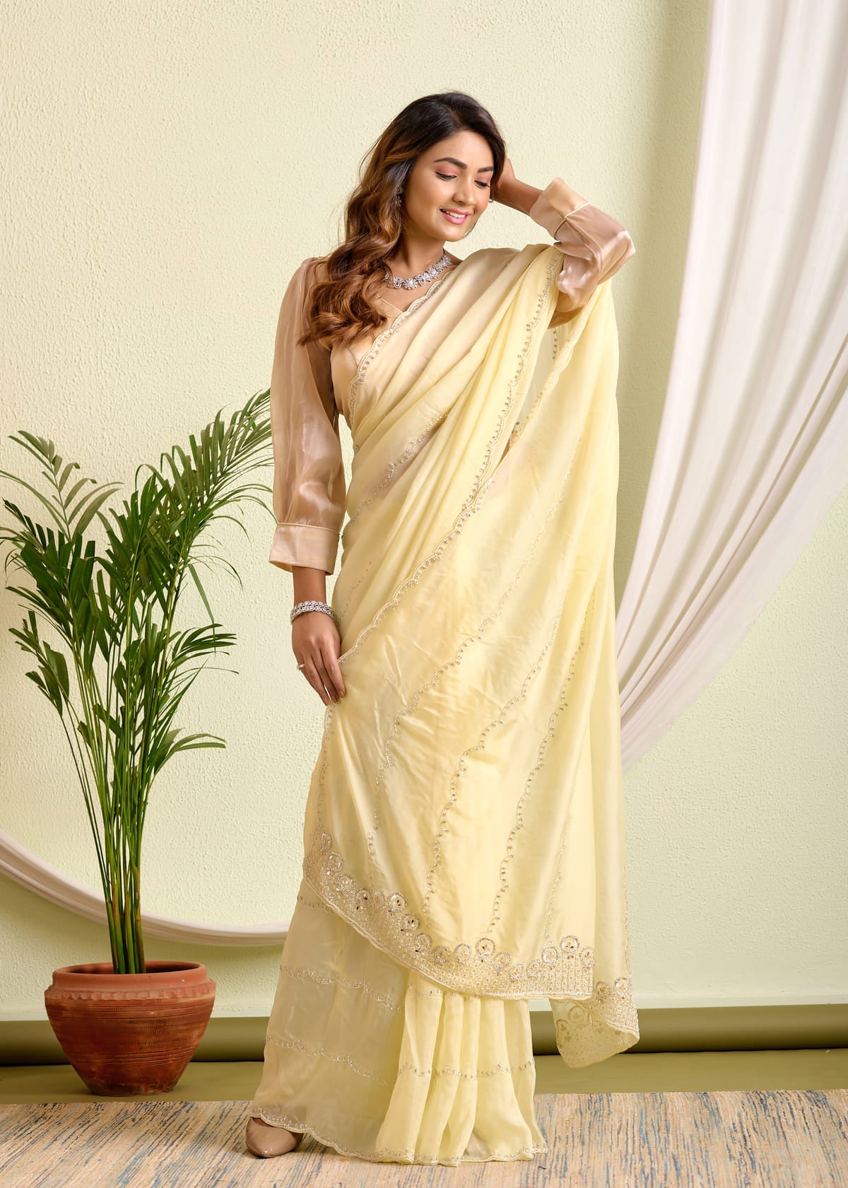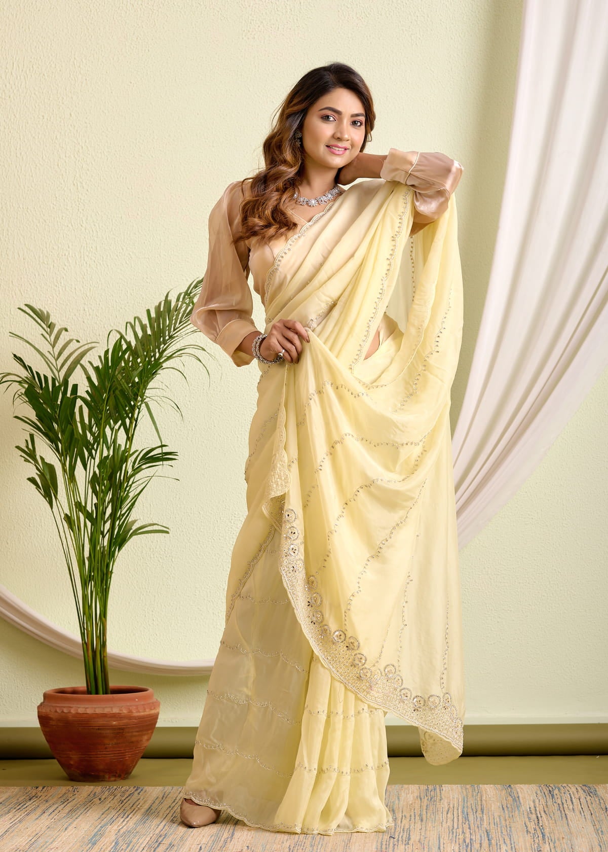 Radiate poise and charm in this effortlessly elegant pale yellow HO silk saree, designed for the modern woman who cherishes classic aesthetics. Crafted from high-quality HO silk, this saree drapes beautifully with a soft, fluid texture that feels luxurious on the skin.