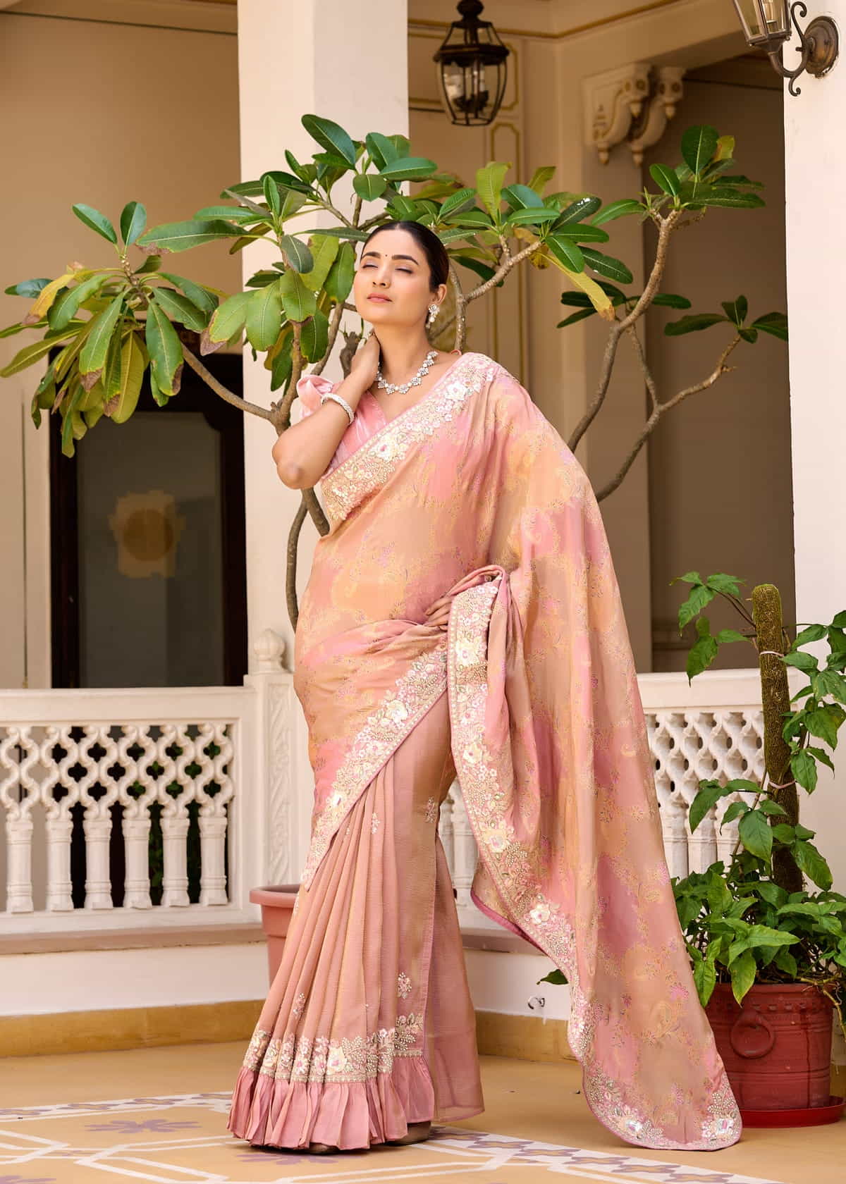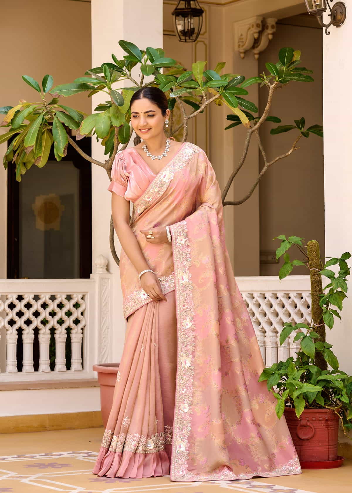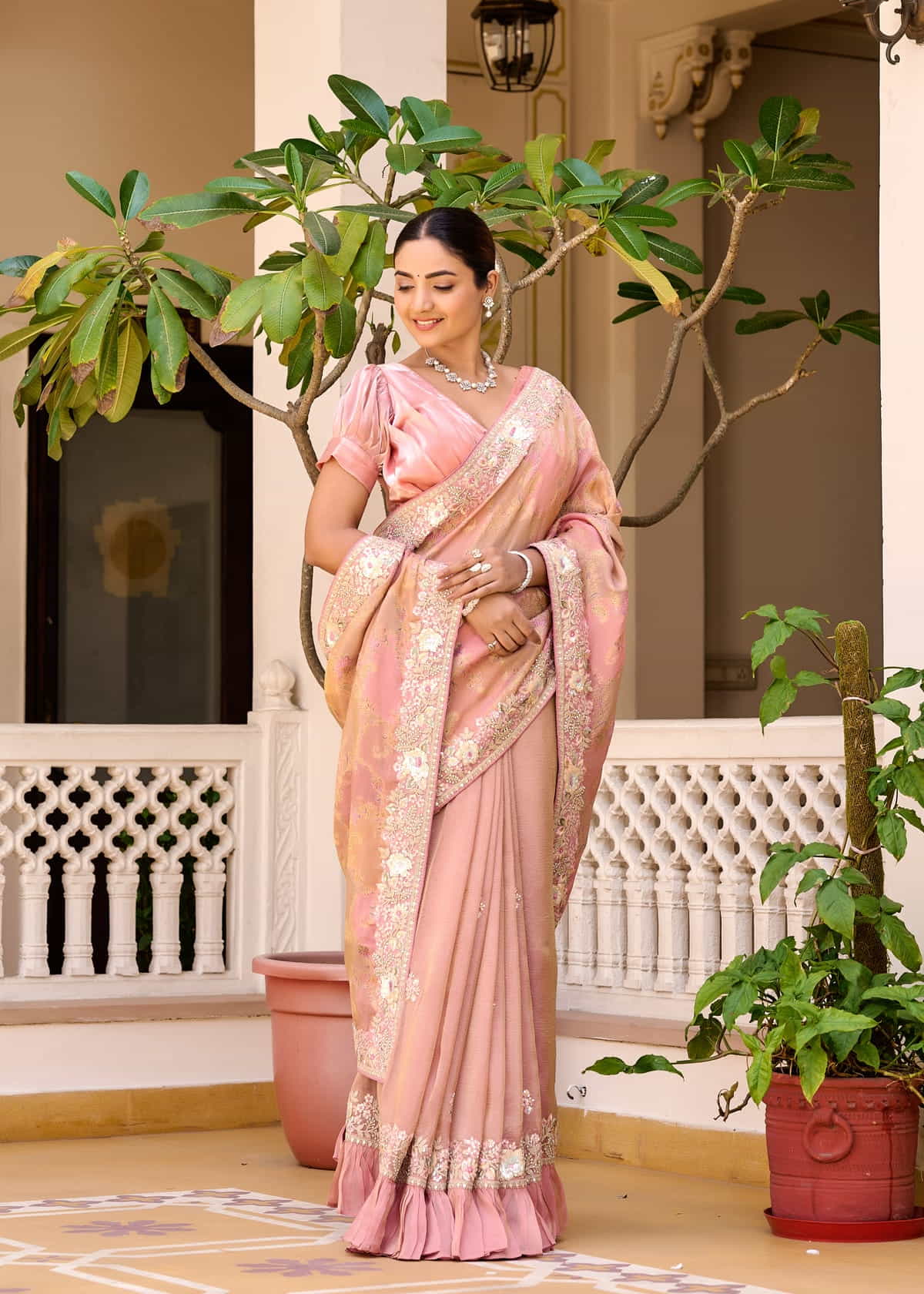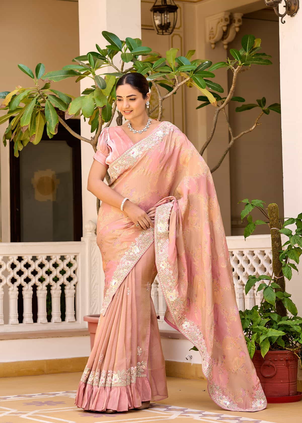 A unique feature of this saree is its frill border, which introduces a modern twist to the classic drape. The soft pleats and flowing pallu create a graceful silhouette, making it an ideal choice for weddings, festive occasions, or elegant evening gatherings. Paired with a beautifully designed puff-sleeved blouse, this saree exudes sophistication and timeless beauty.
