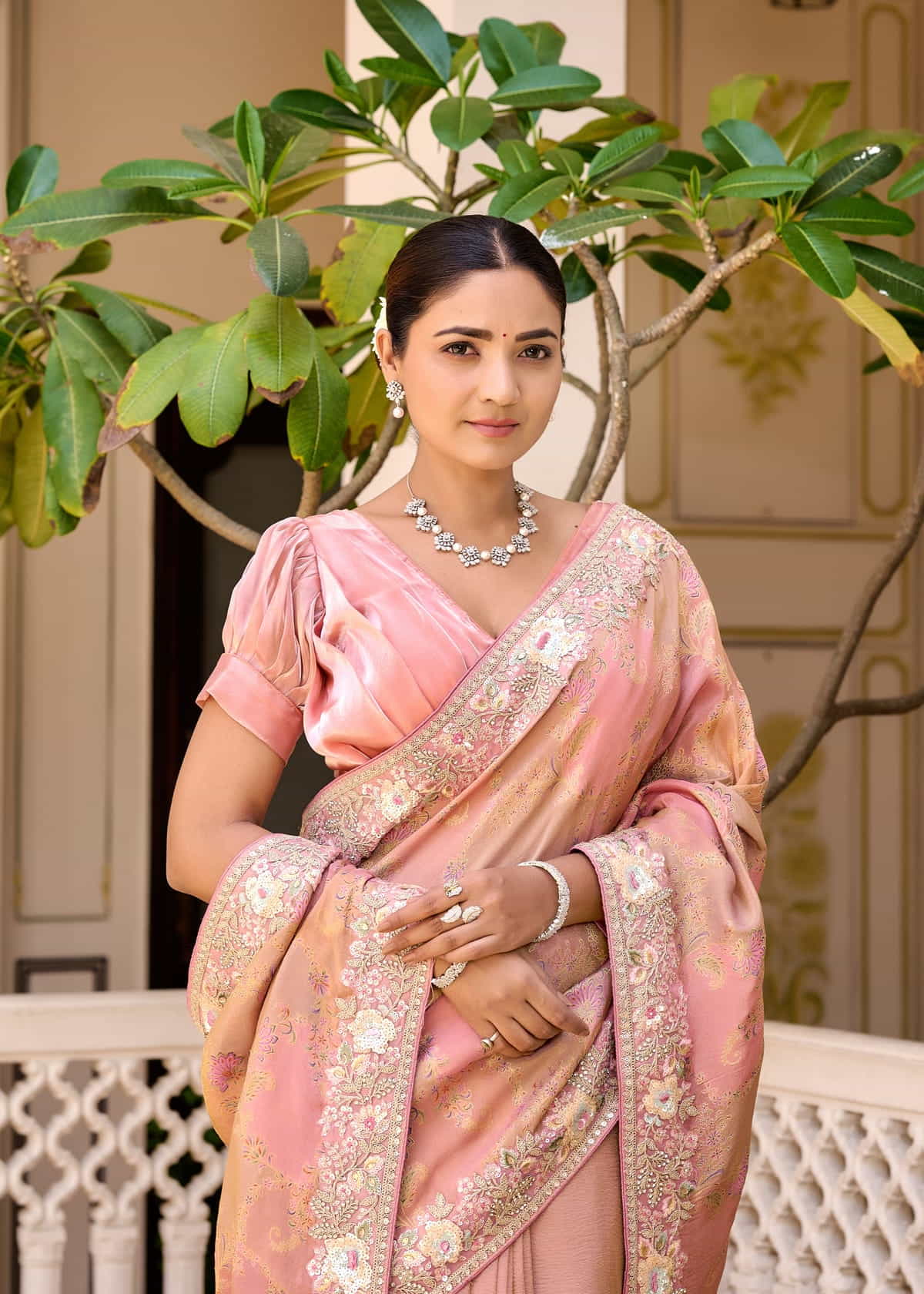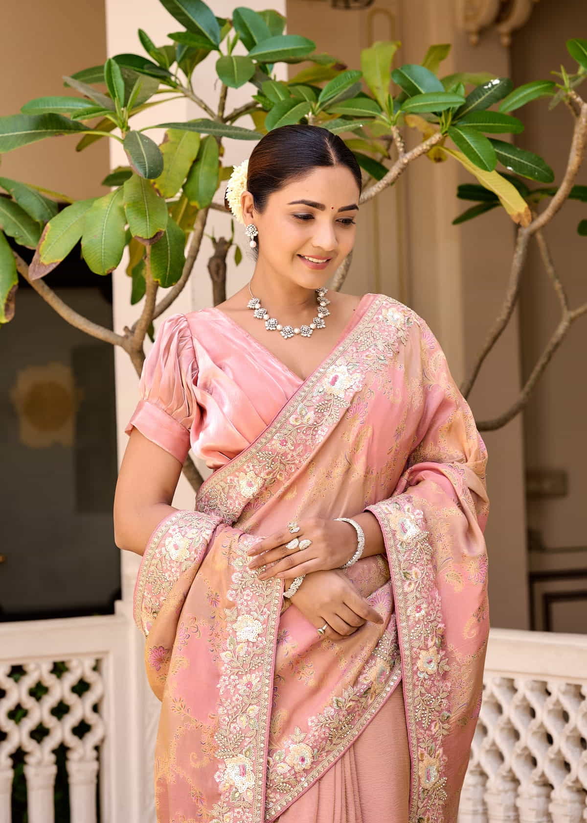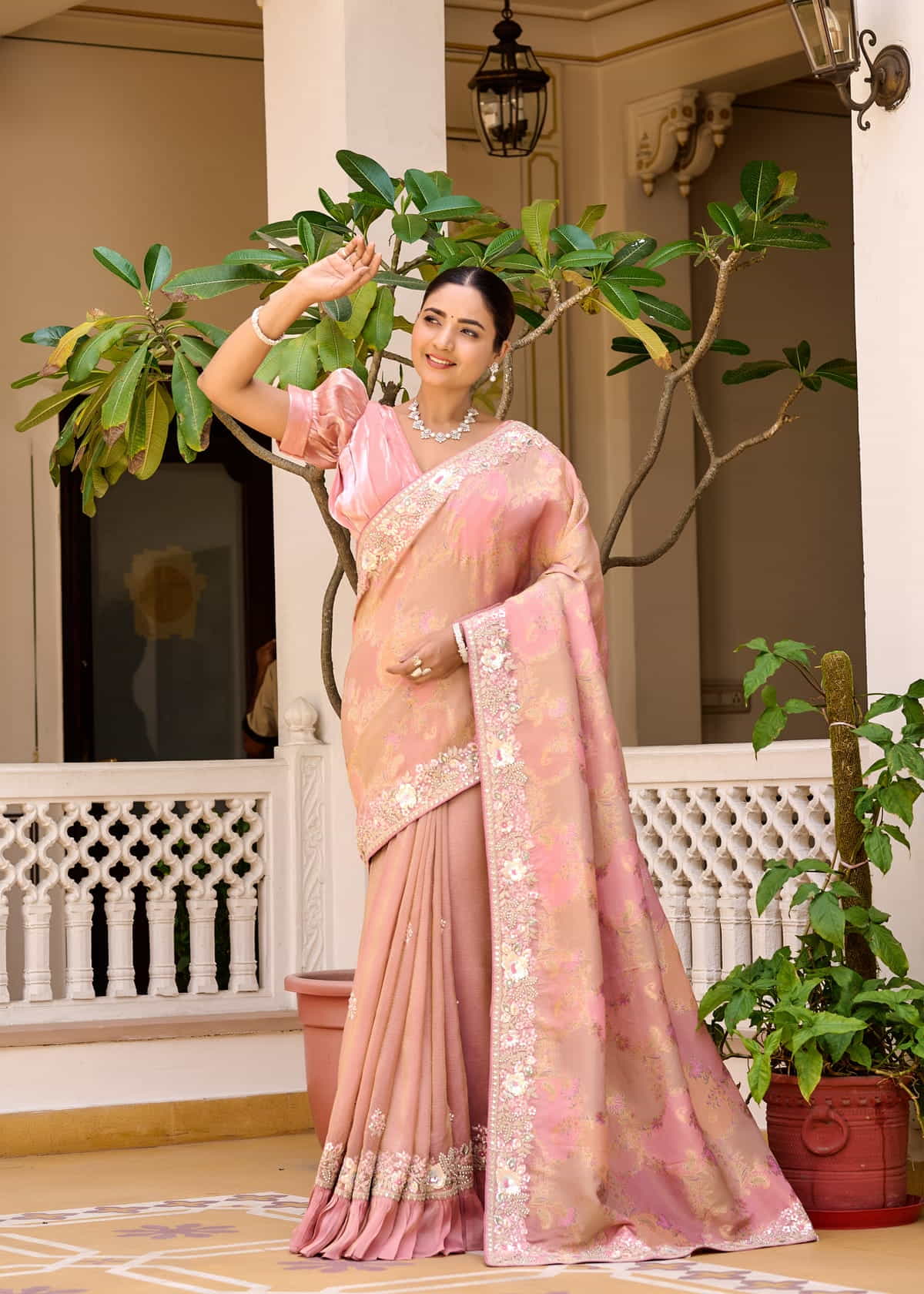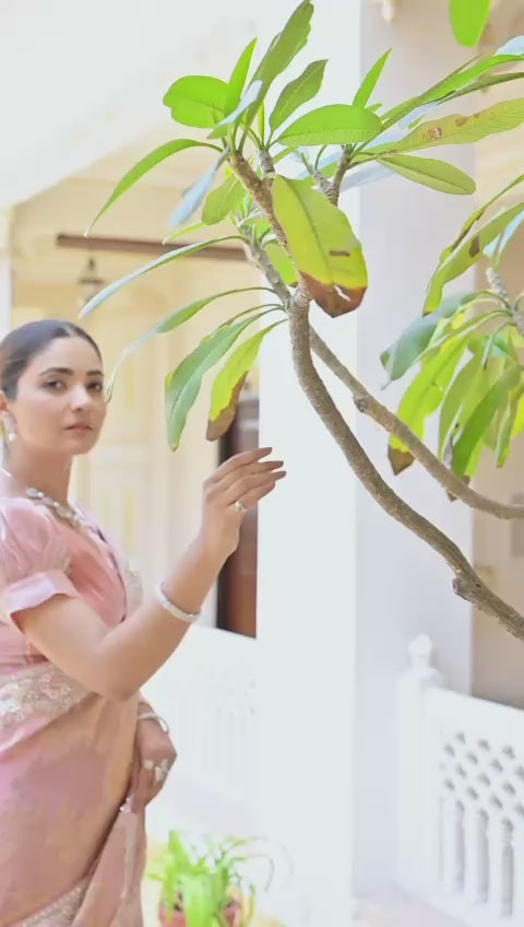 This exquisite Cosmos Zari Saree is a perfect blend of tradition and contemporary elegance. Crafted in a delicate pastel pink shade, it features intricate zari work that adds a touch of regal charm. The saree is adorned with floral embroidery and shimmering embellishments along the border, enhancing its luxurious appeal.
