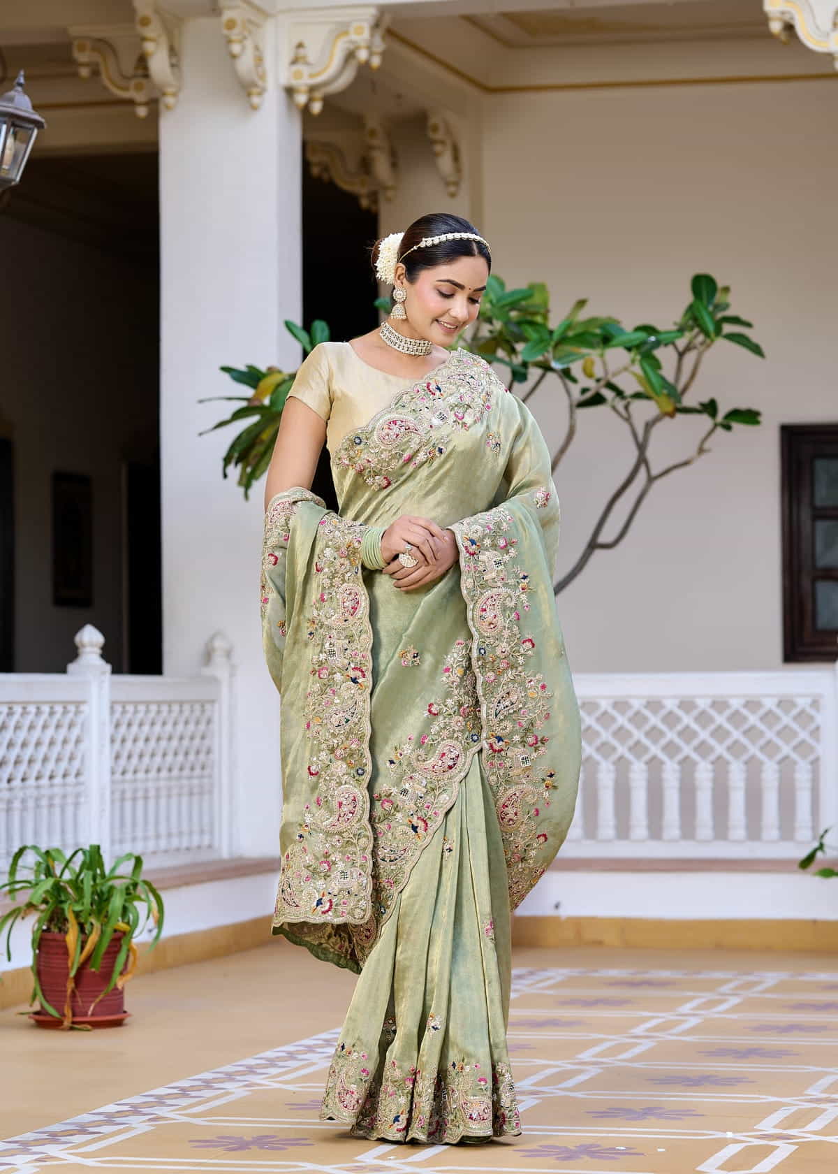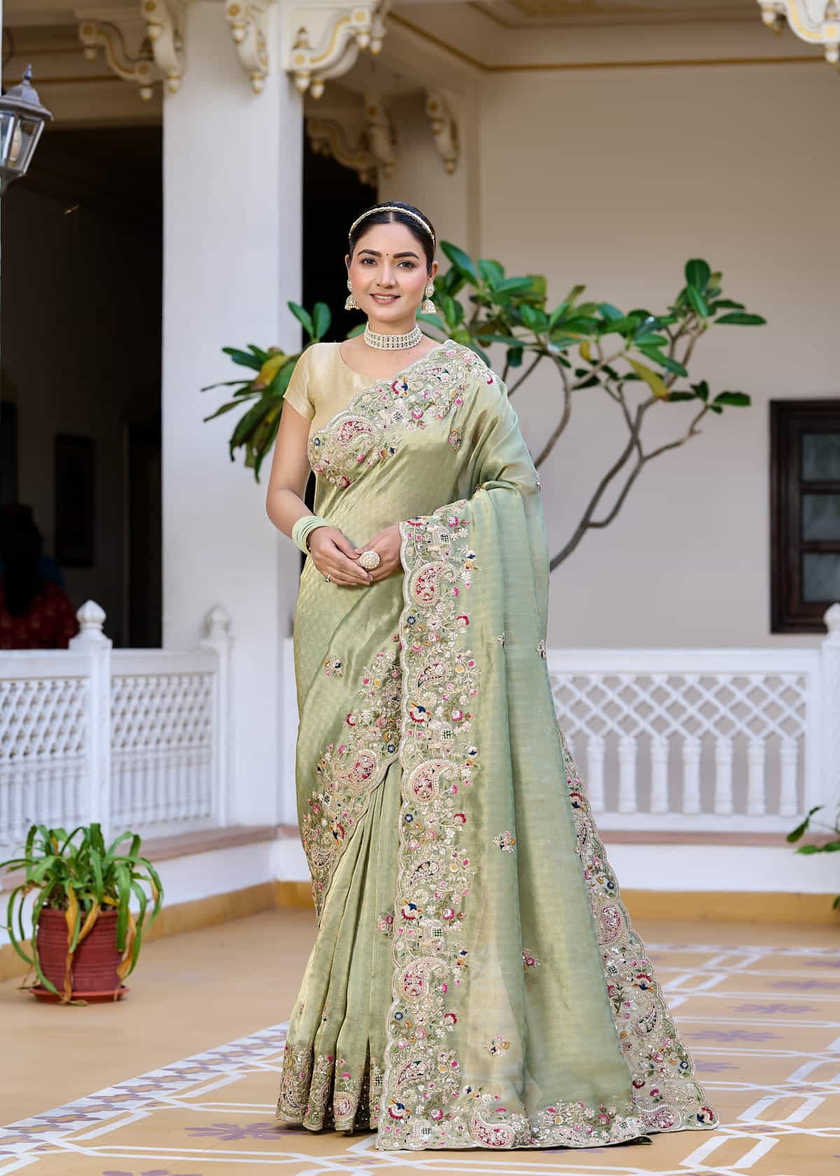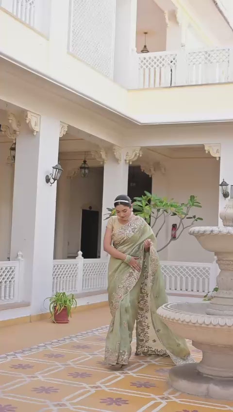 Step into timeless elegance with this ethereal sage green saree, crafted from the finest tissue georgette fabric. Lightweight and effortlessly graceful, the saree flows like a dream, draping beautifully to accentuate your silhouette. The intricate hand embroidery, featuring delicate floral and paisley motifs, is adorned with shimmering sequins, pearls, and resham threadwork, adding a touch of regal sophistication.