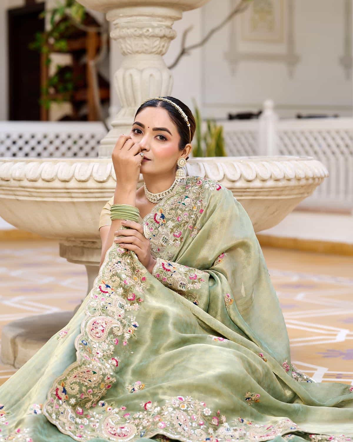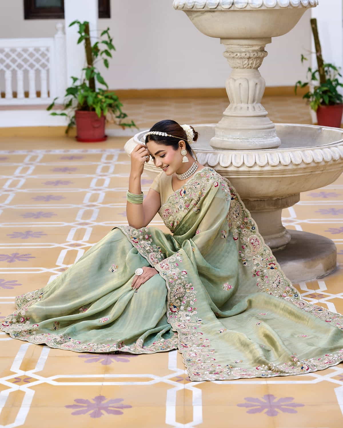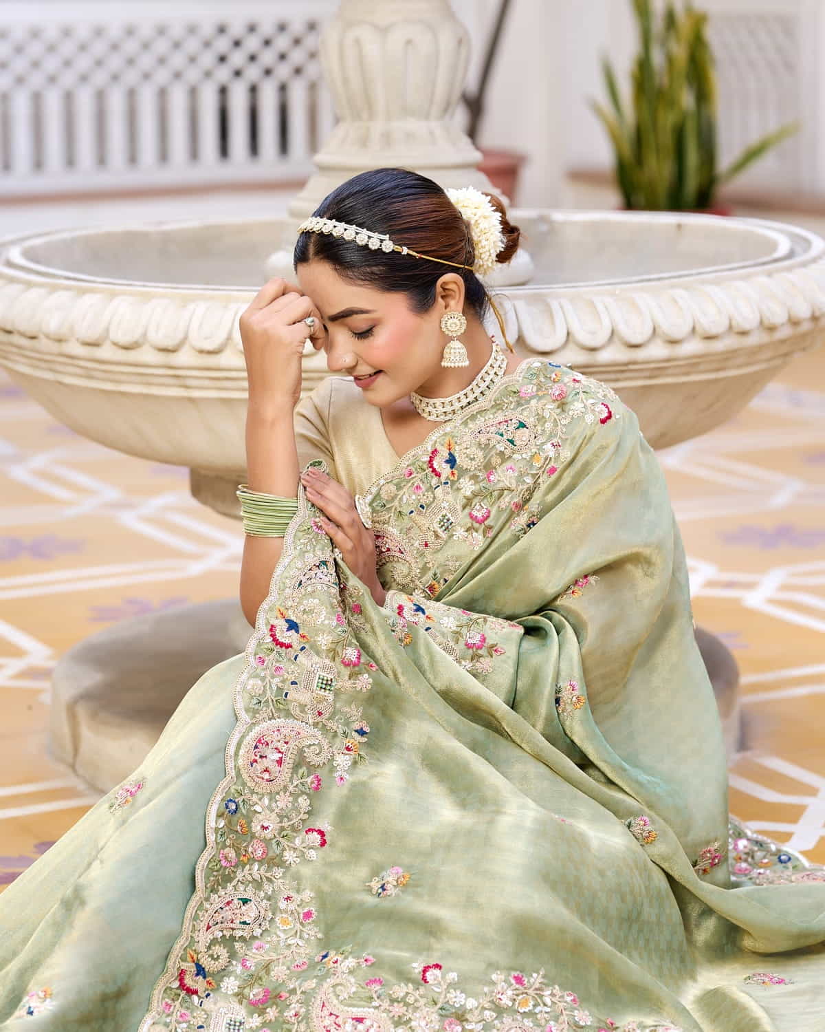 Step into timeless elegance with this ethereal sage green saree, crafted from the finest tissue georgette fabric. Lightweight and effortlessly graceful, the saree flows like a dream, draping beautifully to accentuate your silhouette. The intricate hand embroidery, featuring delicate floral and paisley motifs, is adorned with shimmering sequins, pearls, and resham threadwork, adding a touch of regal sophistication.
