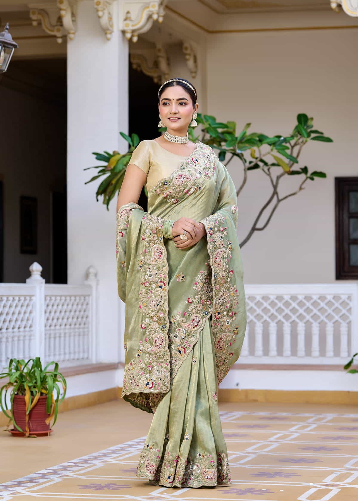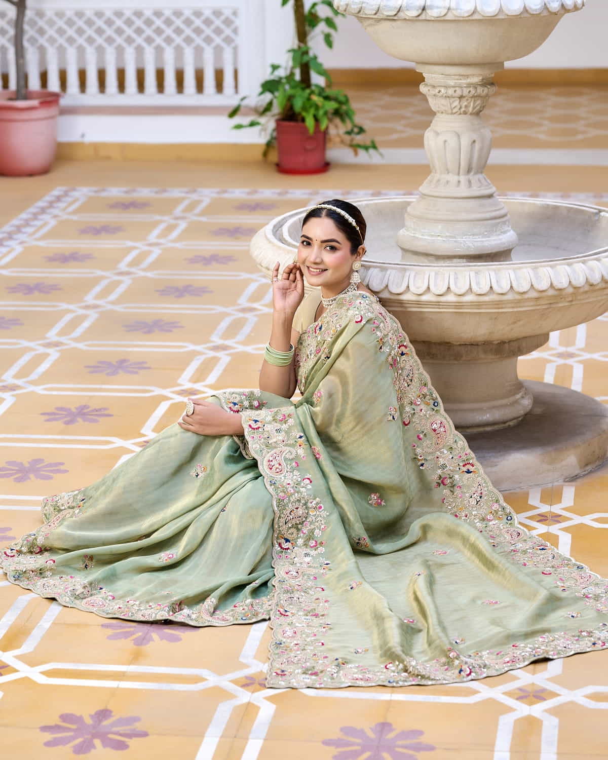 Elegant Sage Green Tissue Georgette Saree