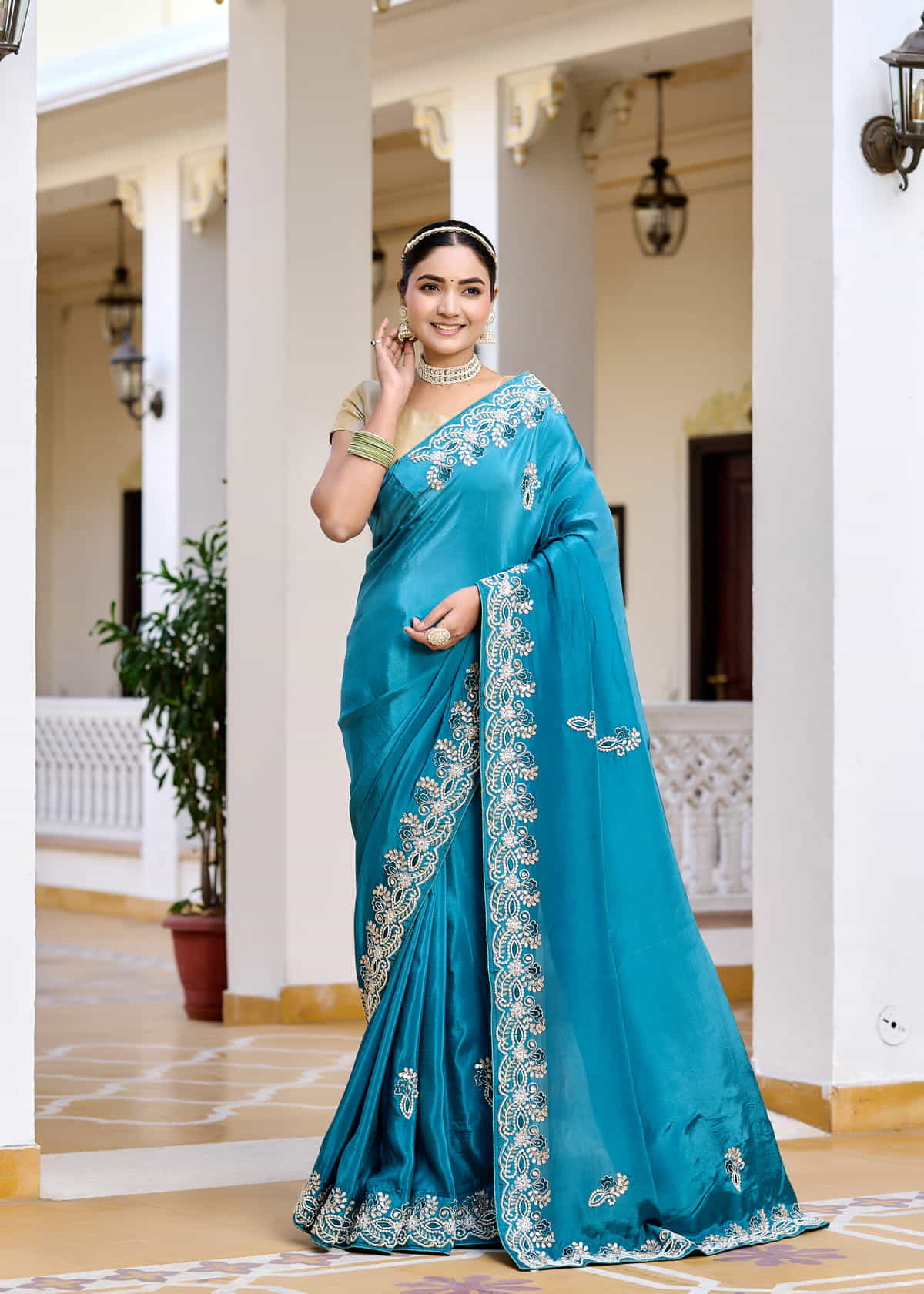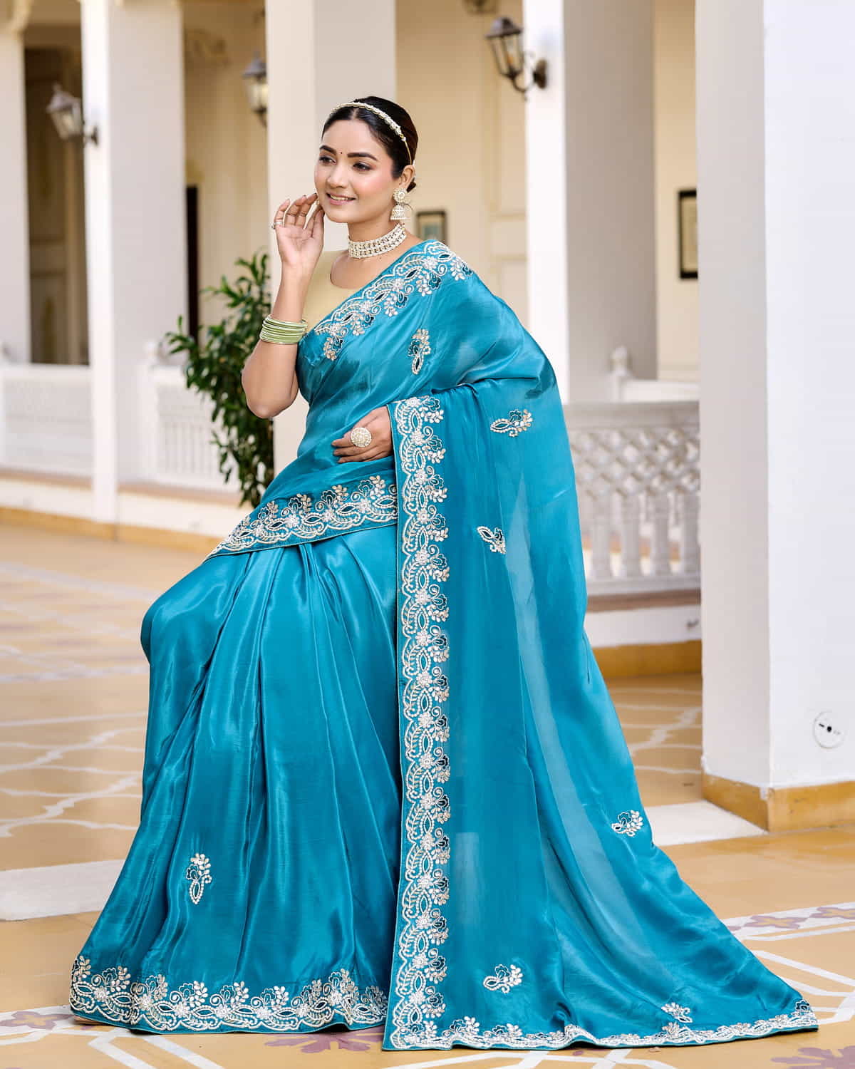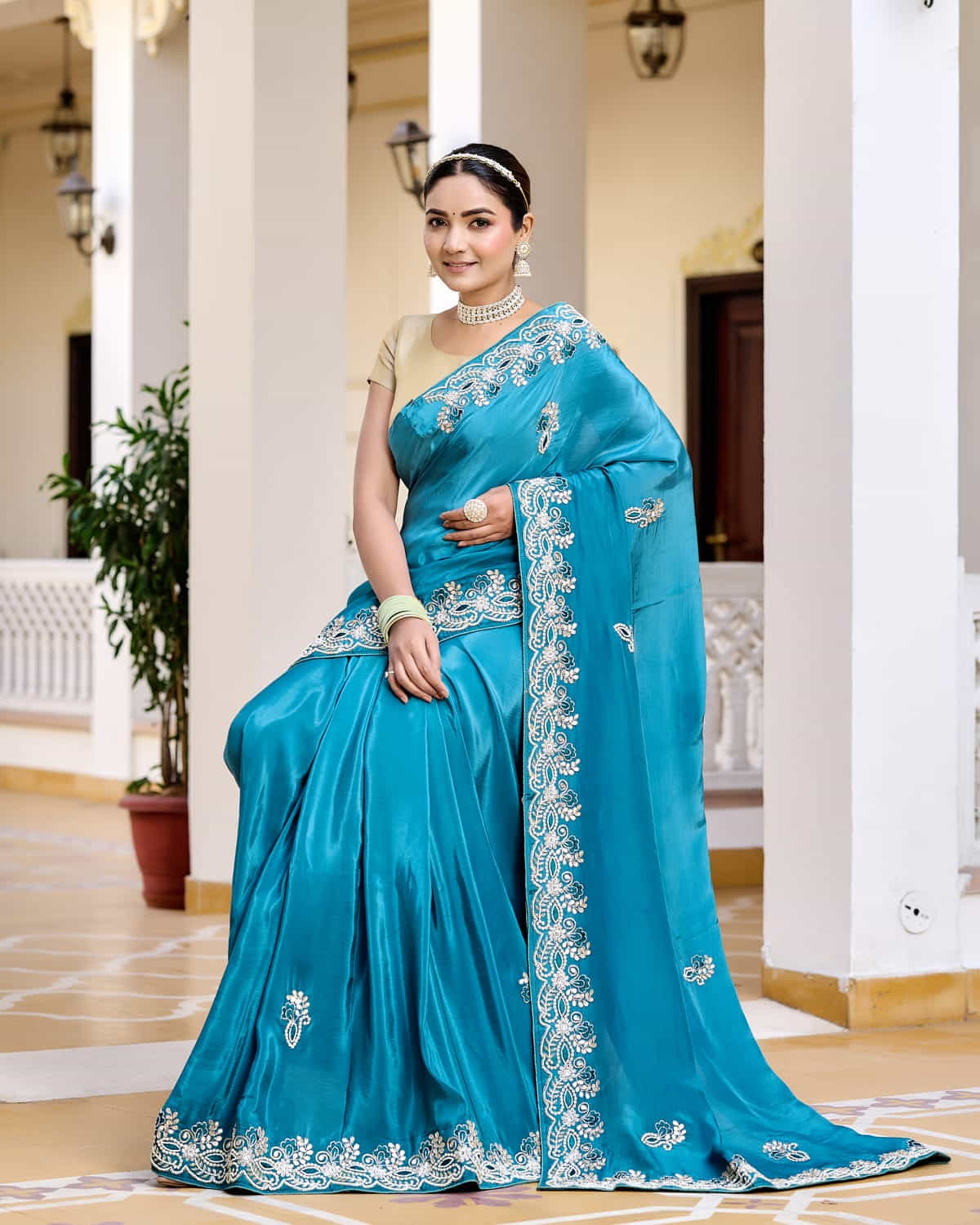 The rich embroidered border, adorned with intricate zari and sequin work, adds a regal touch, while delicate motifs scattered across the saree enhance its overall appeal. The smooth, luxurious texture of the fabric ensures a comfortable drape that complements every body type.
