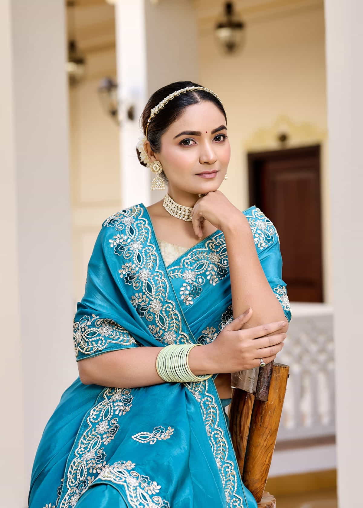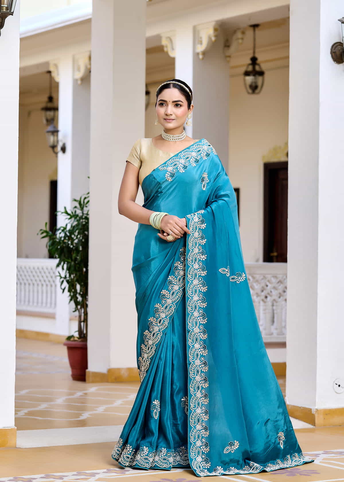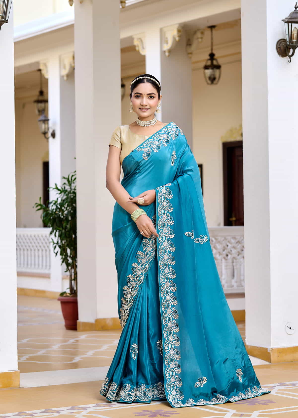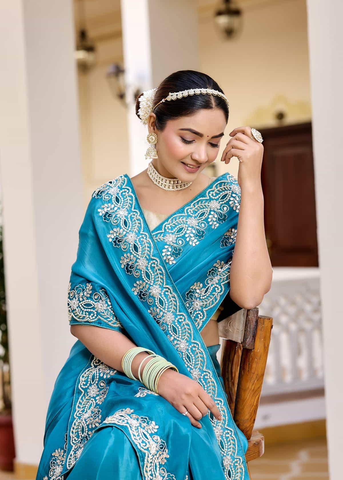 The rich embroidered border, adorned with intricate zari and sequin work, adds a regal touch, while delicate motifs scattered across the saree enhance its overall appeal. The smooth, luxurious texture of the fabric ensures a comfortable drape that complements every body type.