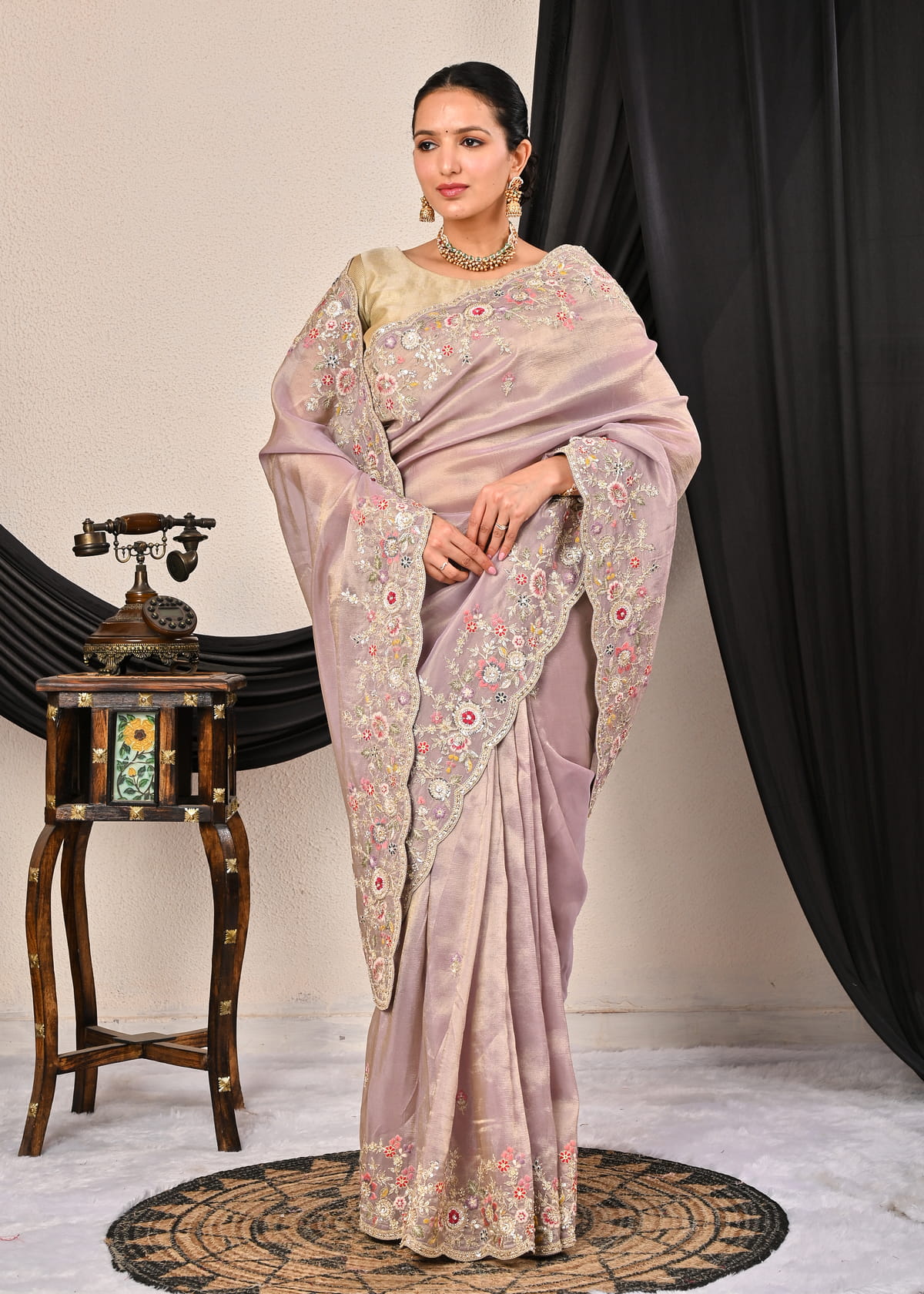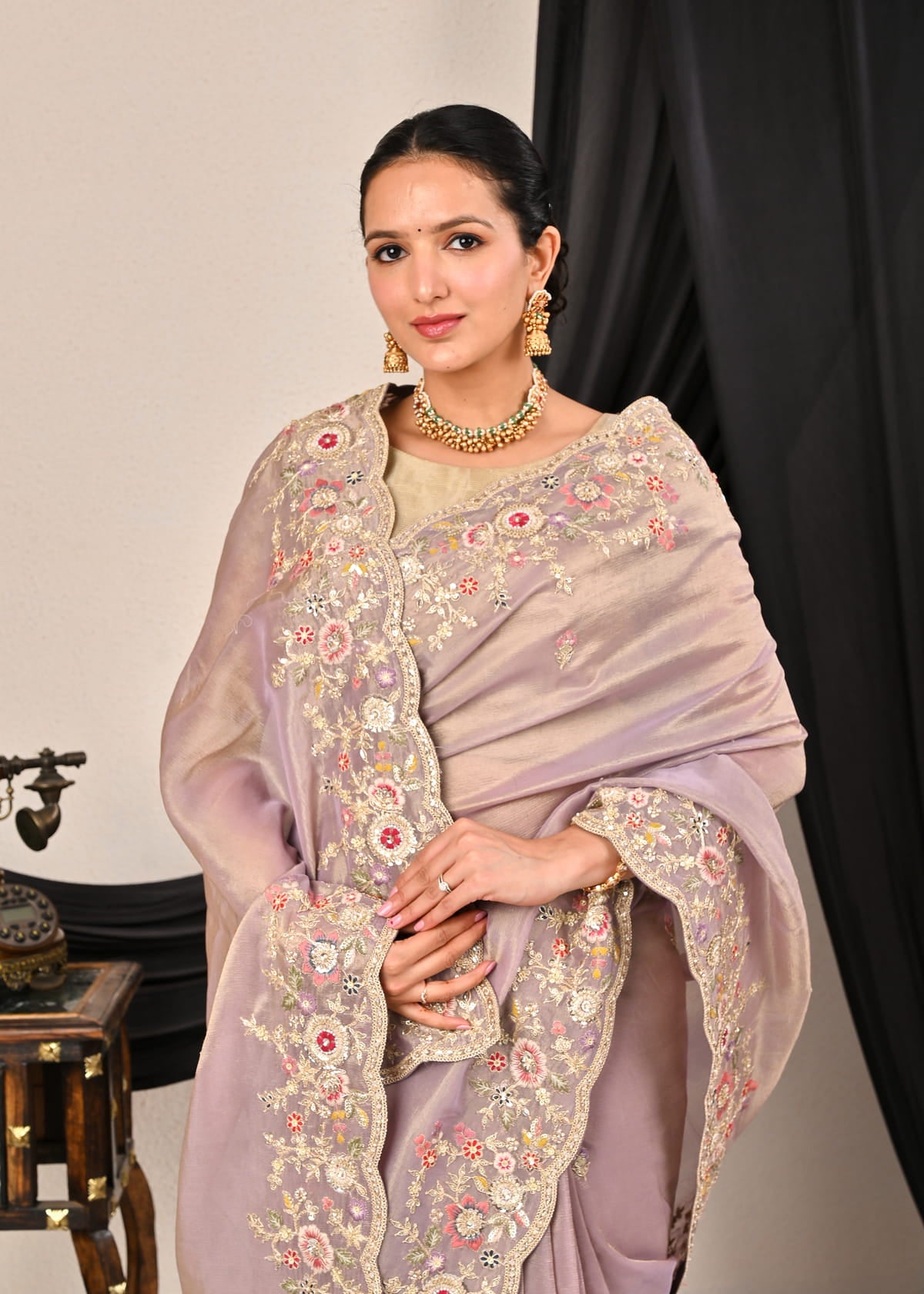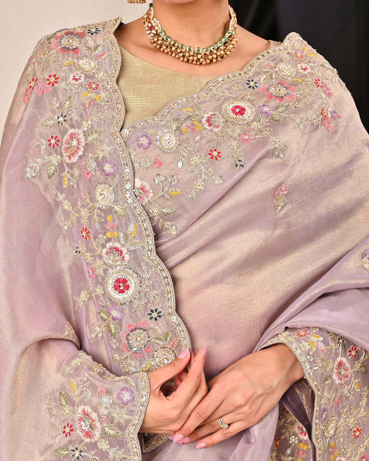 This luxurious tissue saree exudes grace and sophistication, perfect for making a statement at any grand occasion. Drenched in a soft, muted lavender hue, the fabric shimmers elegantly, enhancing its ethereal charm.