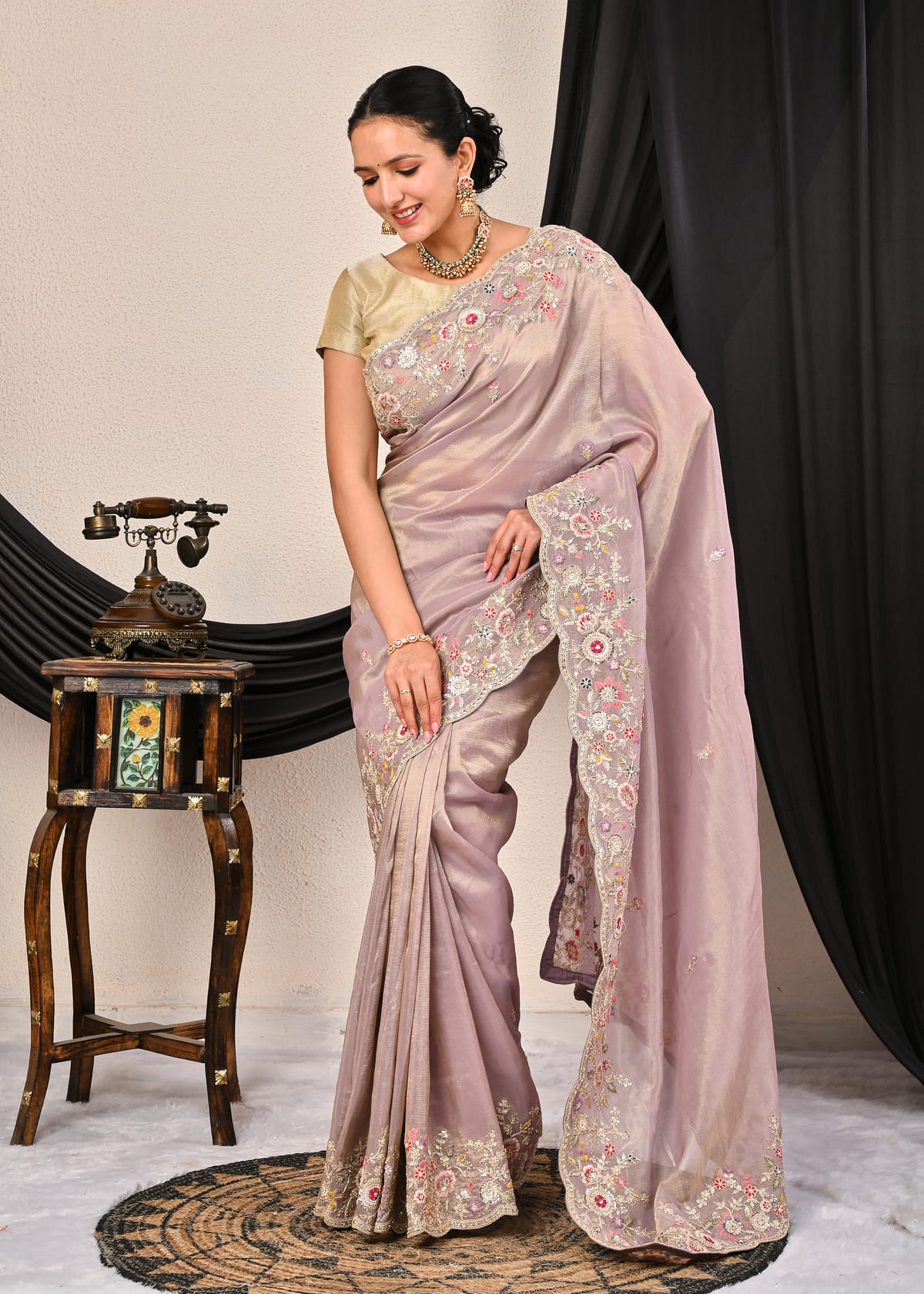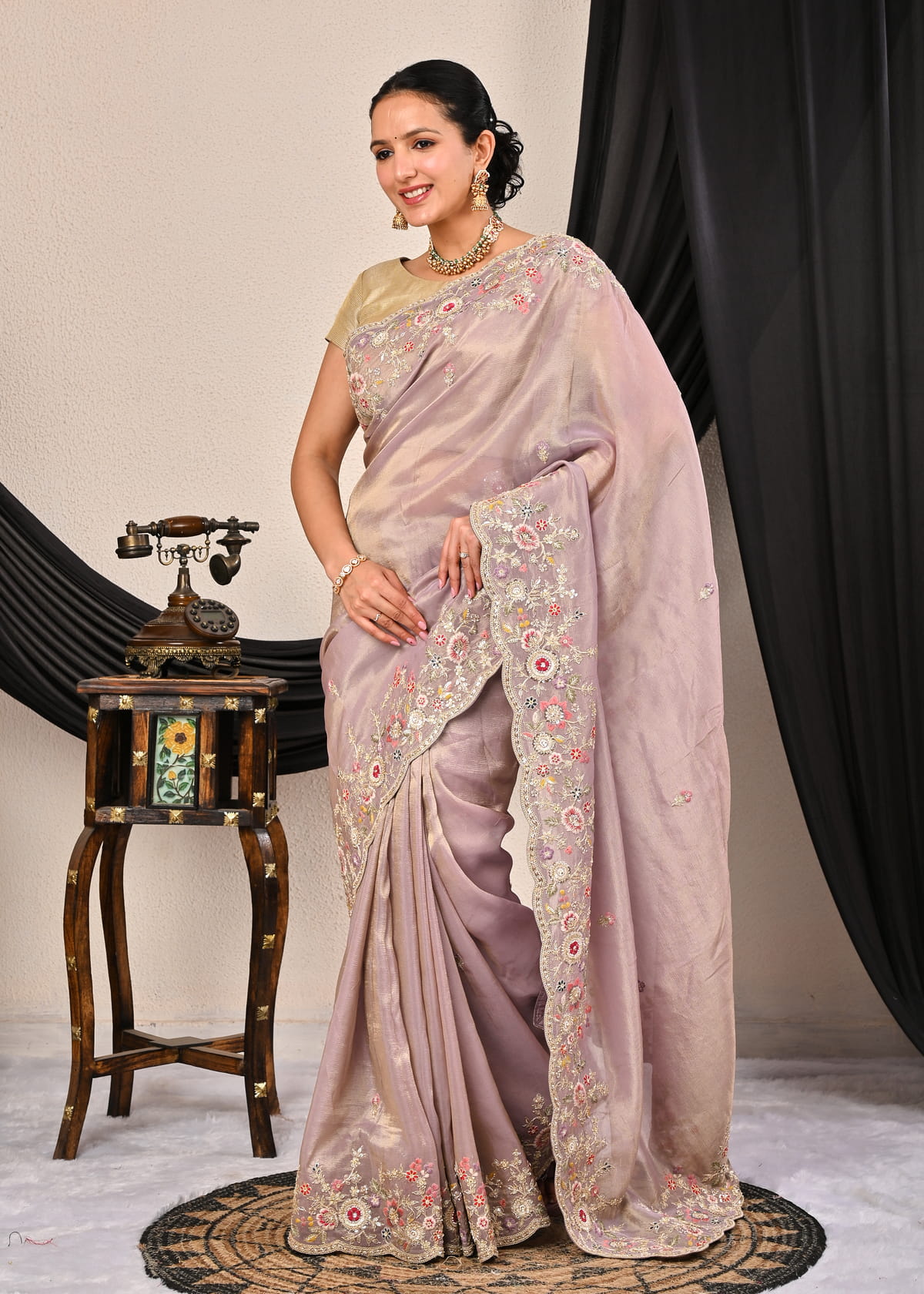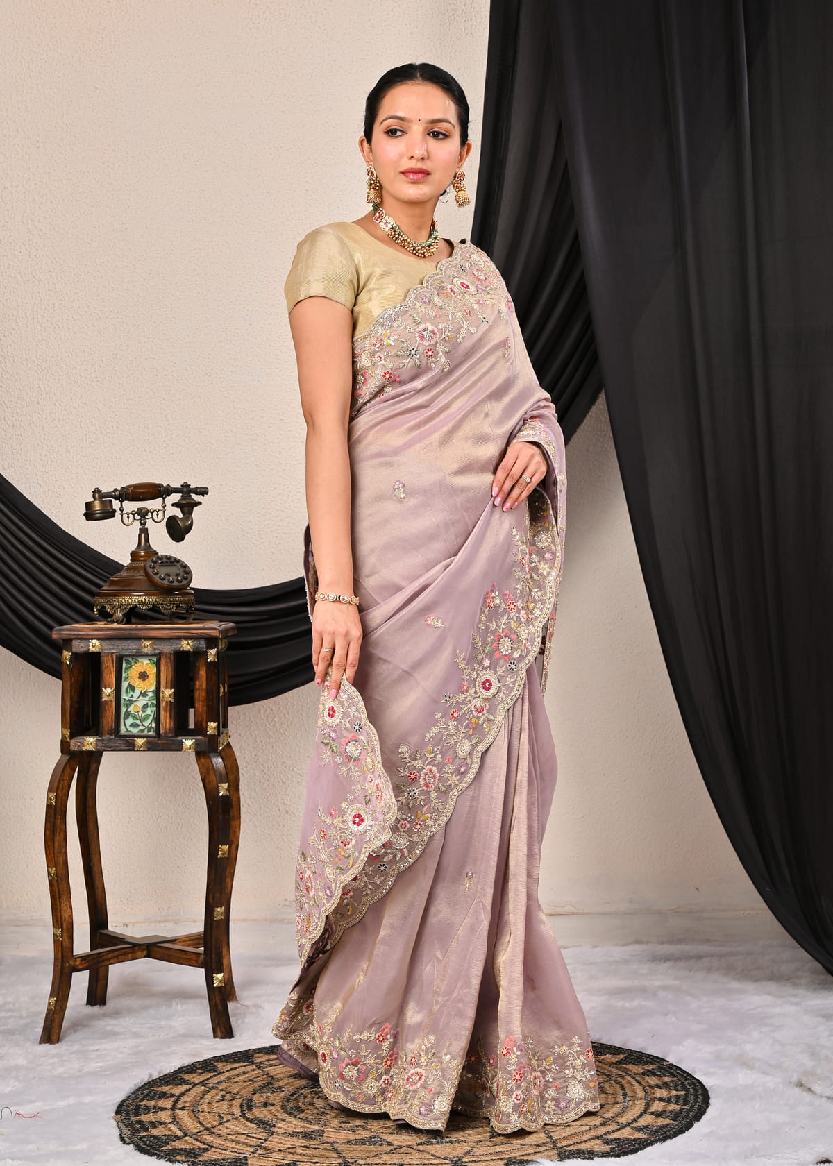 This luxurious tissue saree exudes grace and sophistication, perfect for making a statement at any grand occasion. Drenched in a soft, muted lavender hue, the fabric shimmers elegantly, enhancing its ethereal charm.