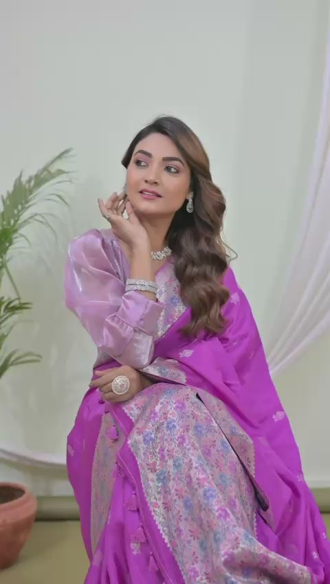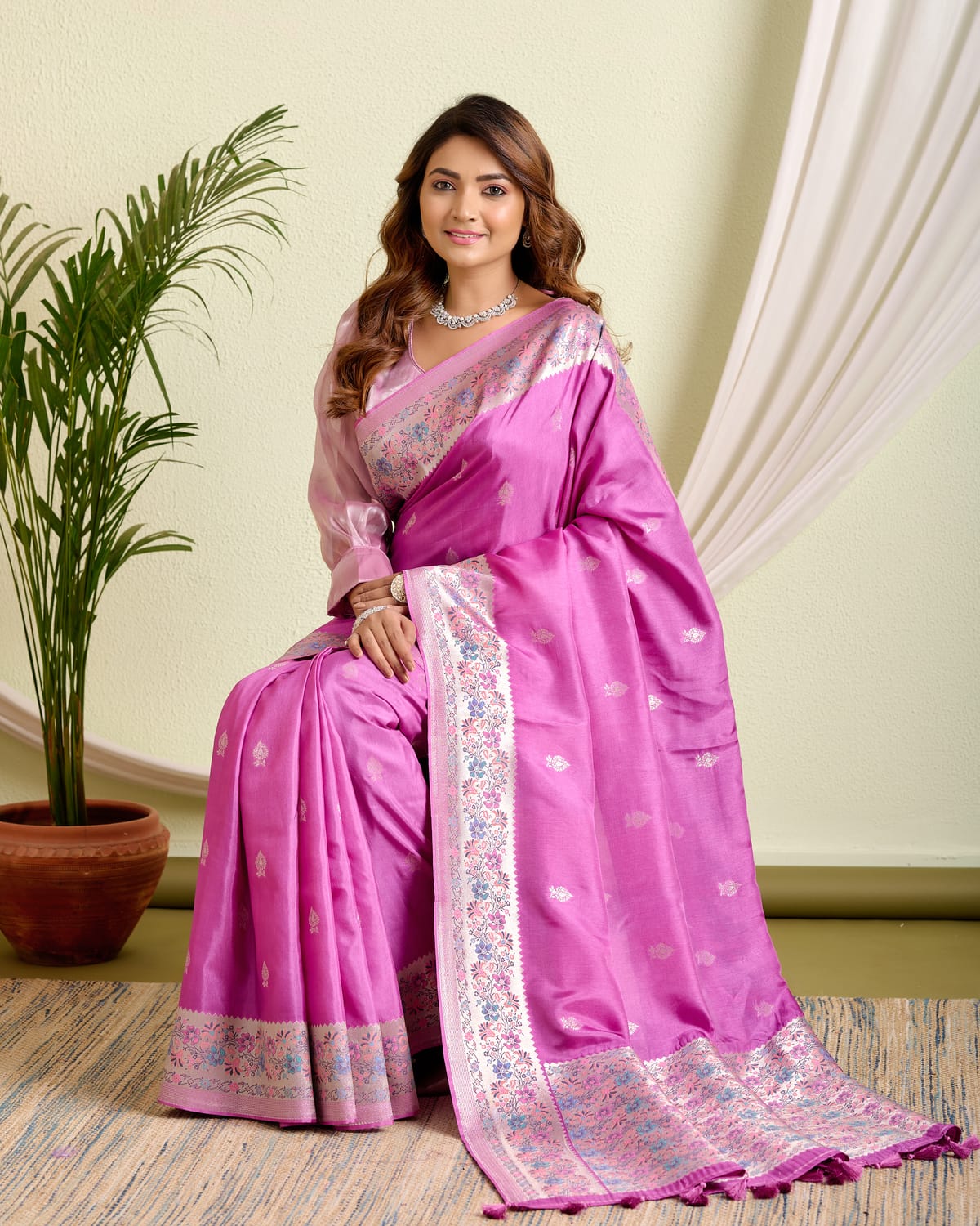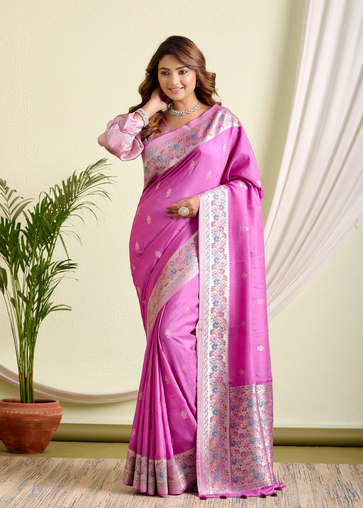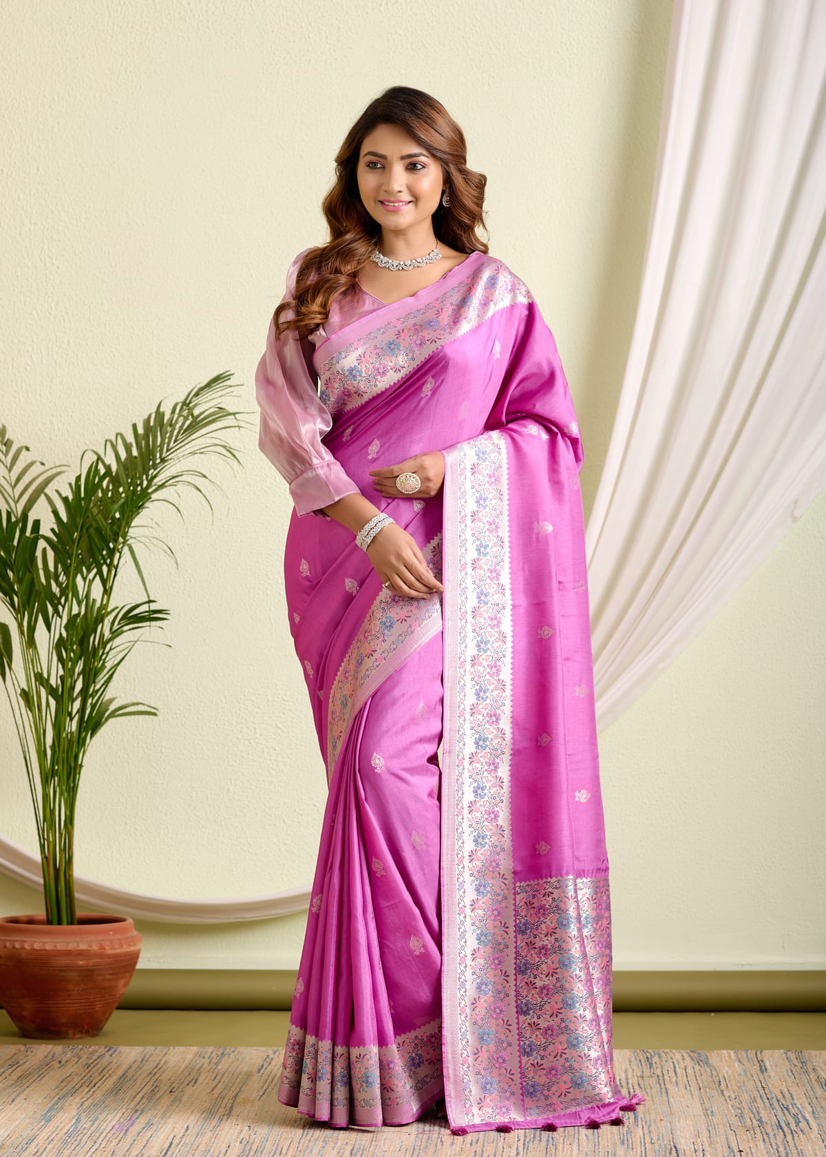 Turn heads with this vibrant magenta Cosmos silk saree, a true celebration of tradition blended with contemporary allure. Crafted from fine Cosmos silk, the saree boasts a silky-smooth texture and a radiant finish that elevates your festive and occasionwear style.