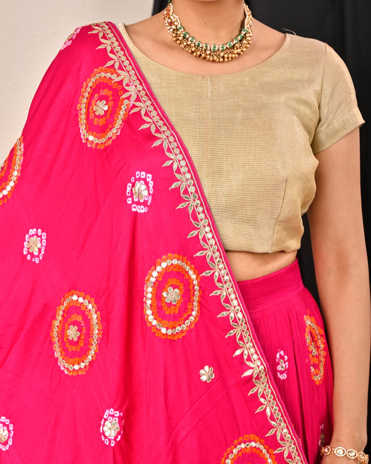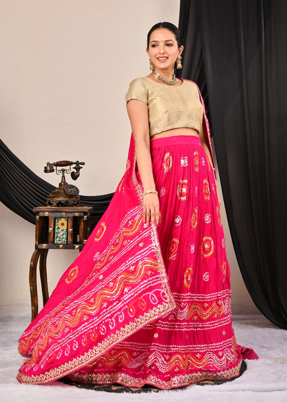 The lehenga, crafted from rich, lustrous Gajji silk, is adorned with intricate Bandhani patterns, enhanced by the mesmerizing shimmer of gota patti work. The delicate embroidery and reflective details add a regal touch, making it ideal for festive occasions and weddings.
