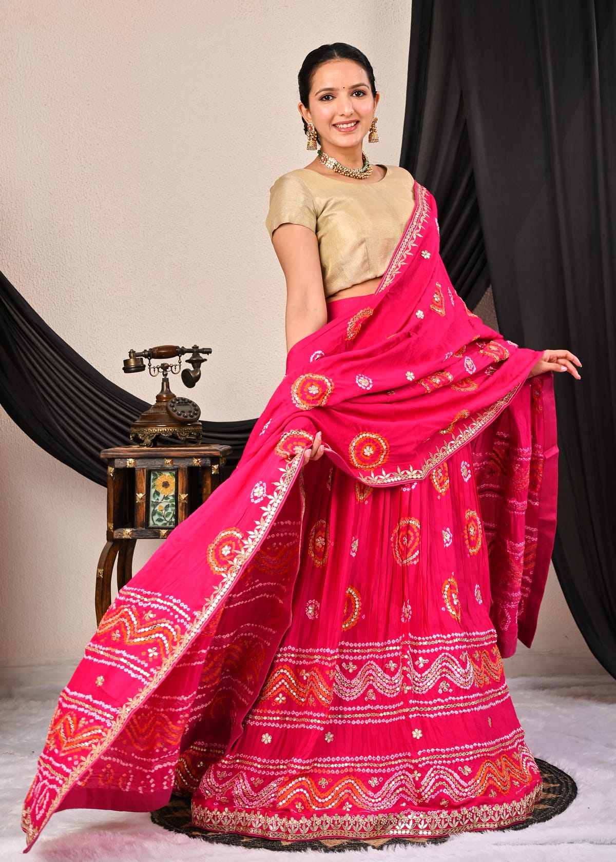 This exquisite pure Gajji silk lehenga-chunni is a stunning blend of tradition and luxury, perfect for the modern woman who cherishes timeless heritage. Drenched in a vibrant fuchsia pink, this ensemble is a celebration of culture, artistry, and elegance.