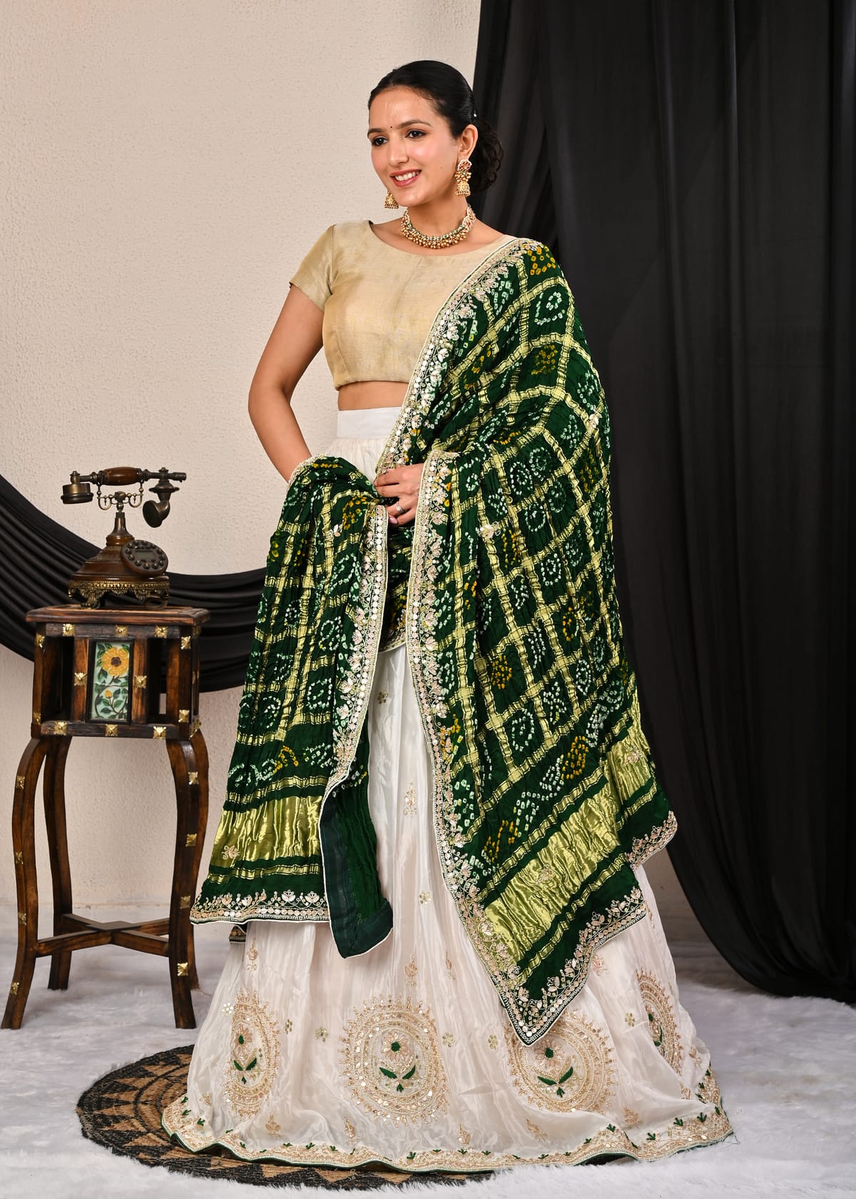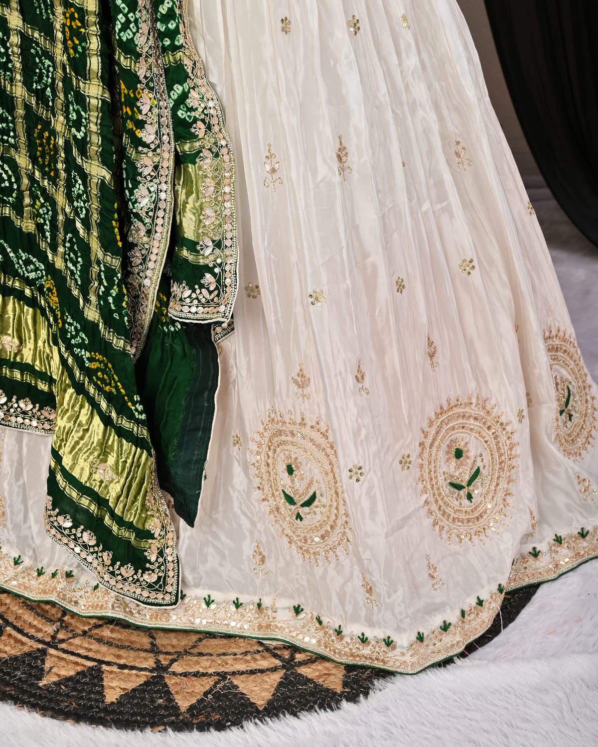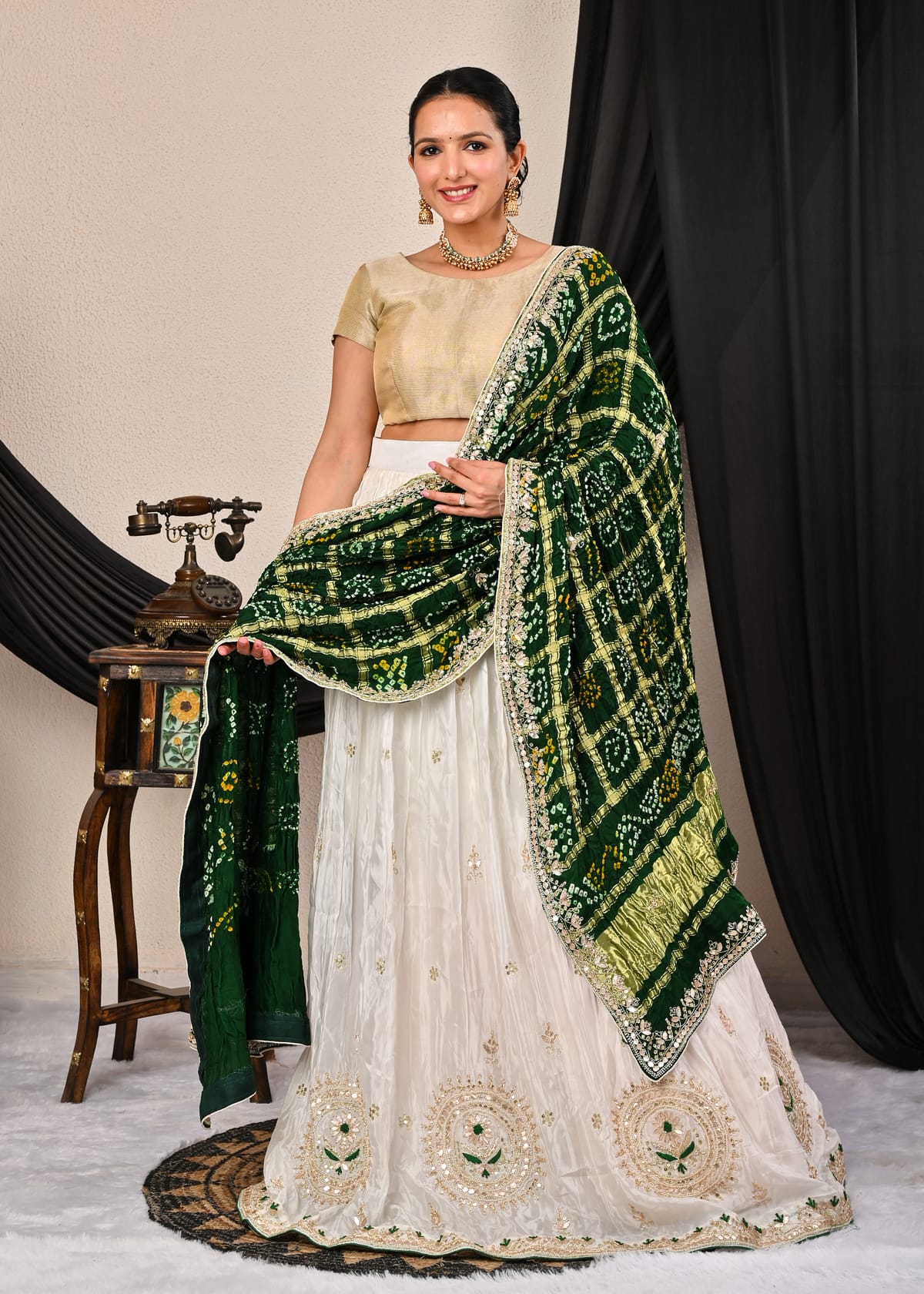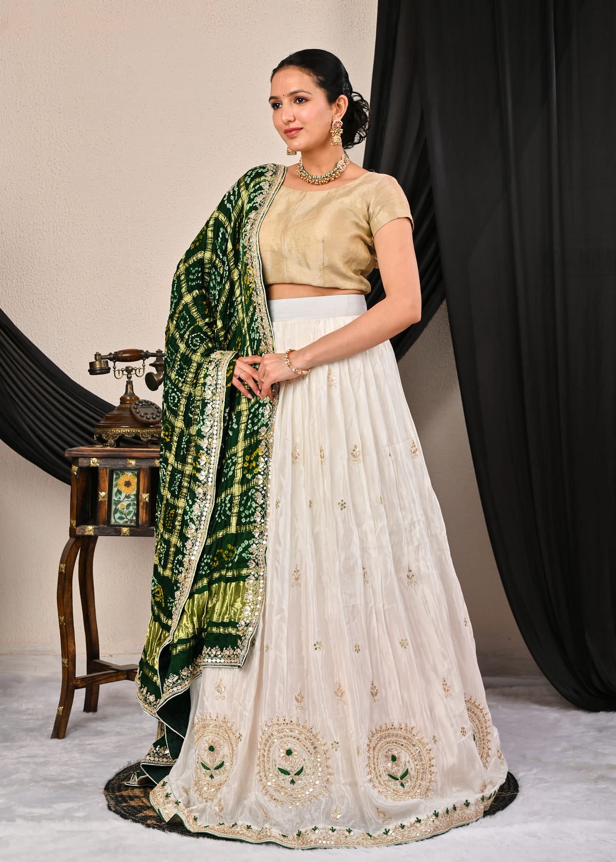 Complementing this stunning piece is the pure Gajji silk Ghatchola dupatta, a true work of art. Draped gracefully over the shoulders, the dupatta boasts delicate motifs and subtle embellishments that enhance its traditional appeal. Its soft texture and fluid drape add an ethereal elegance to the overall look, making it perfect for festive celebrations, weddings, or any grand occasion.