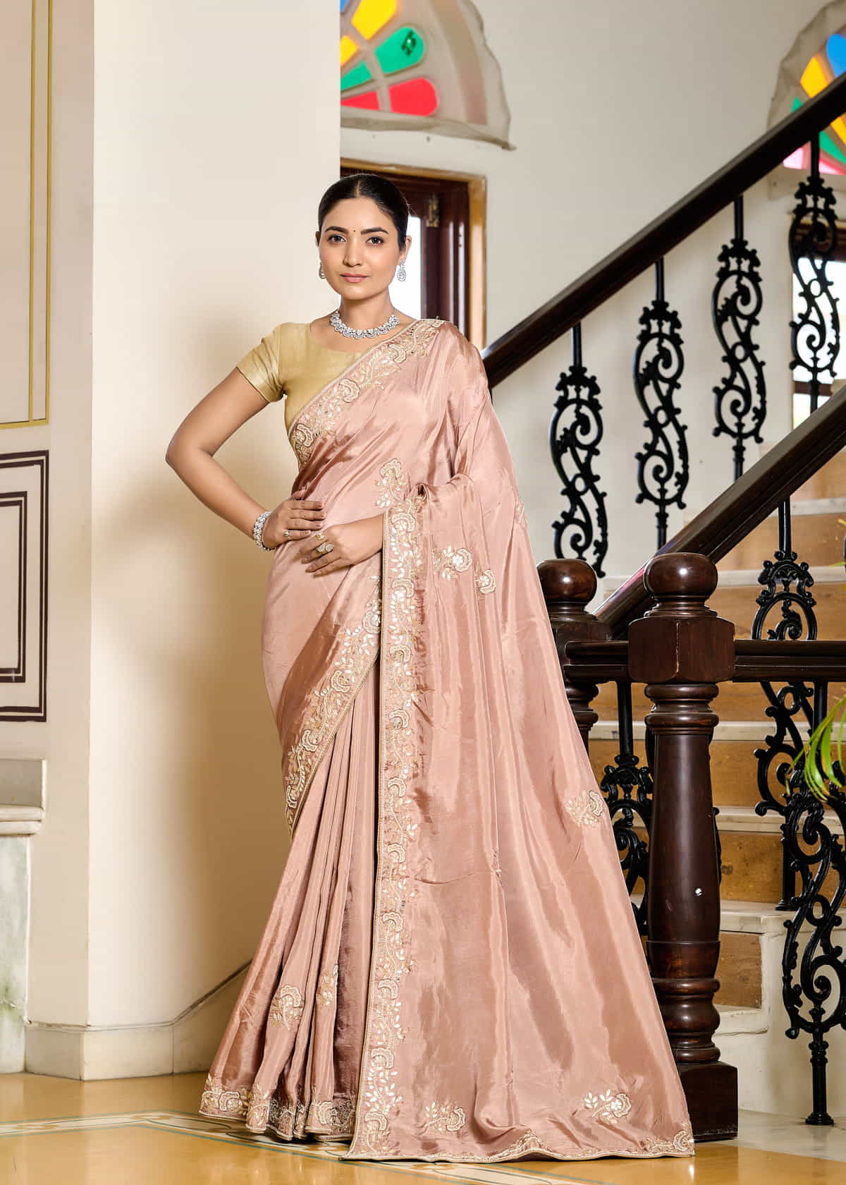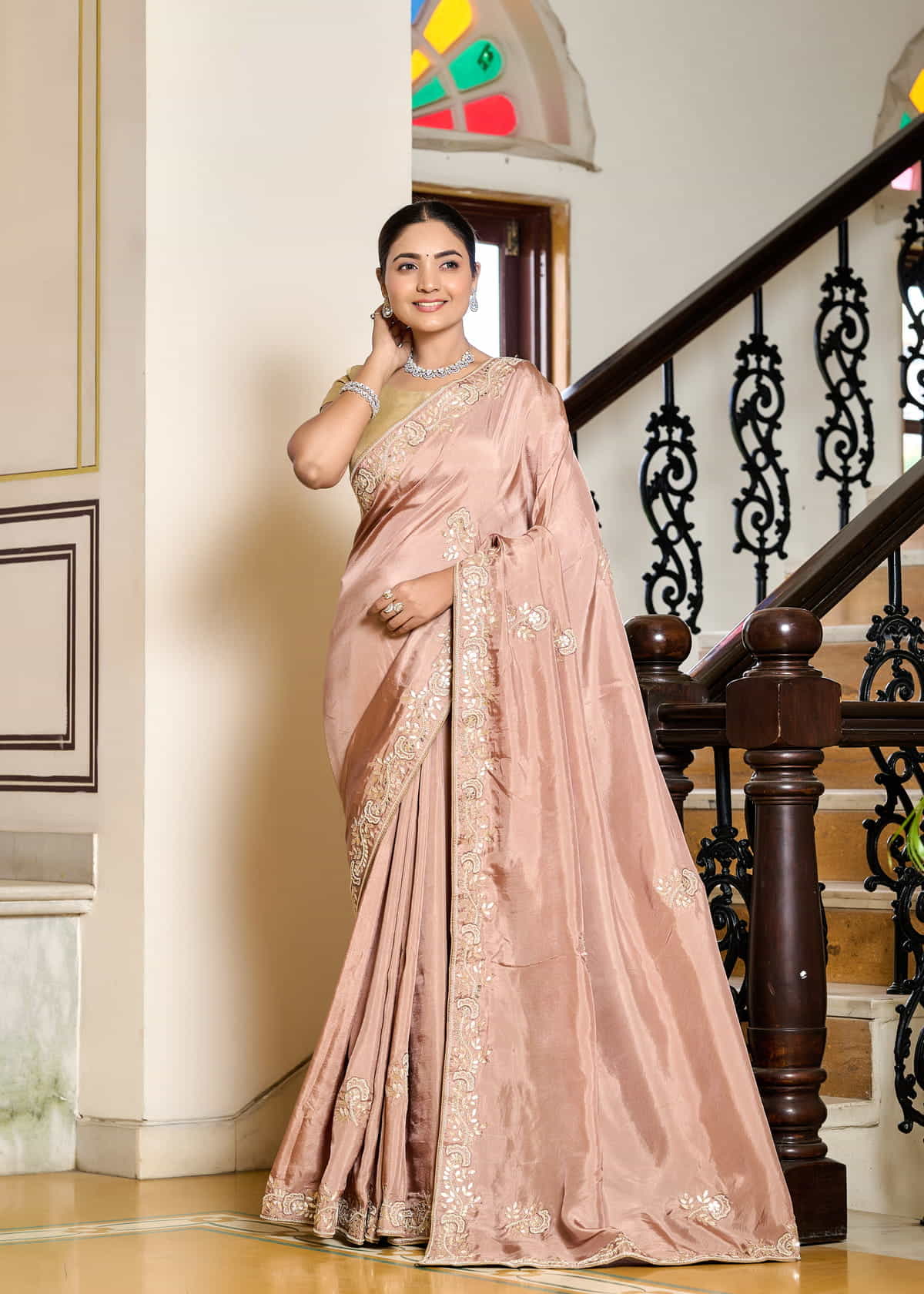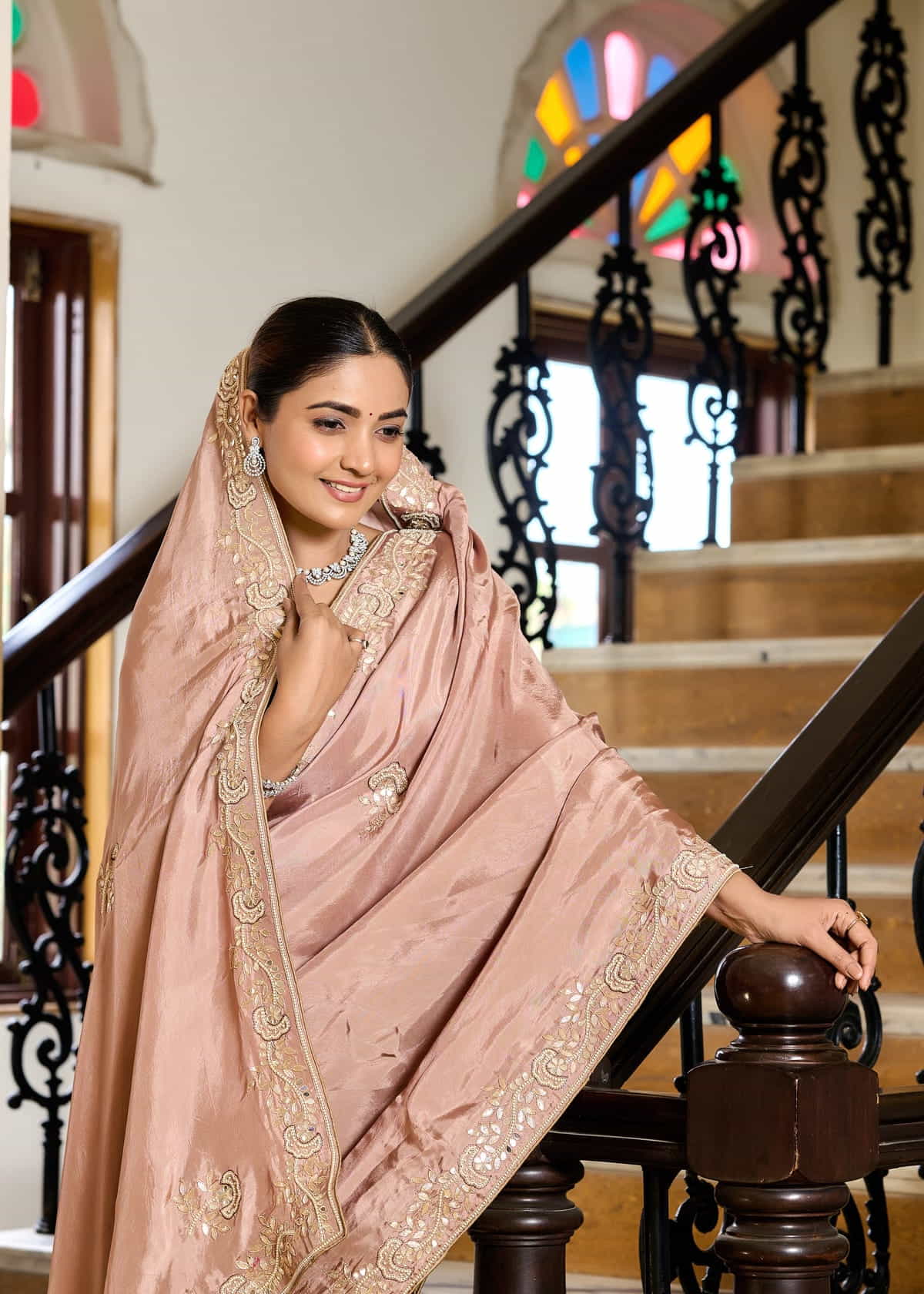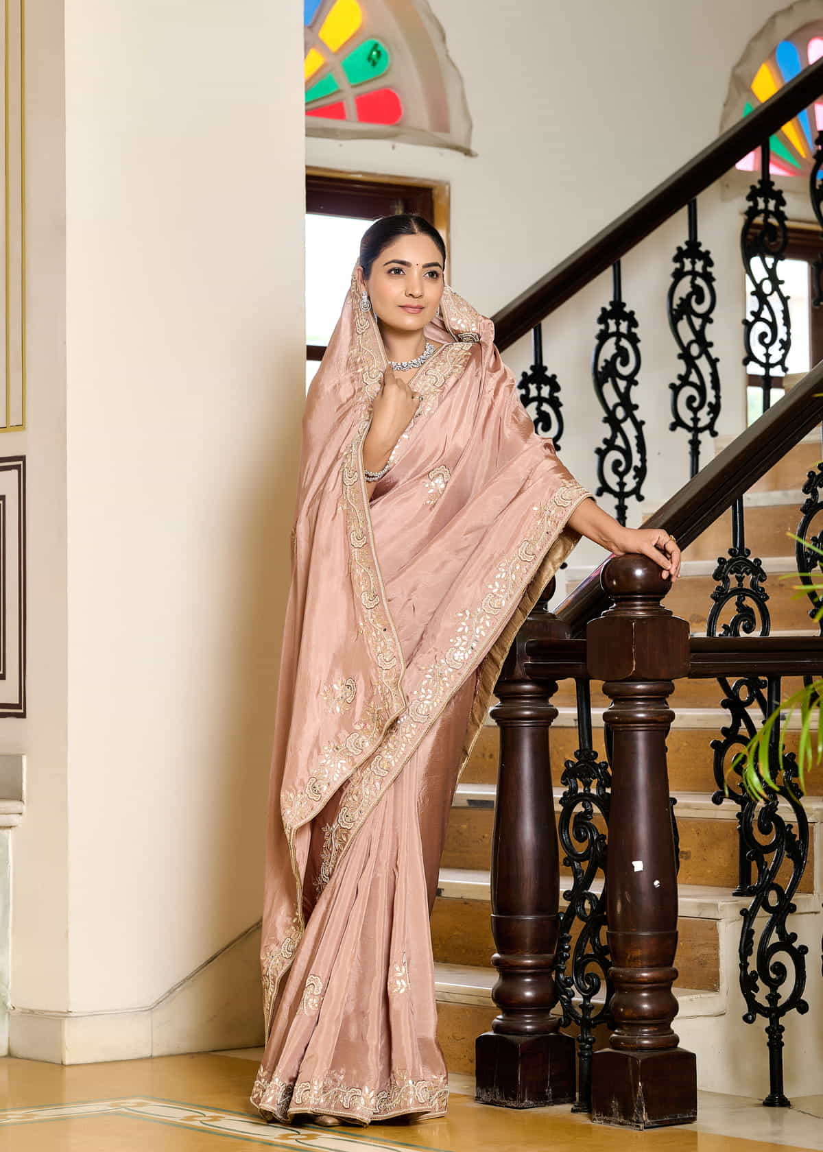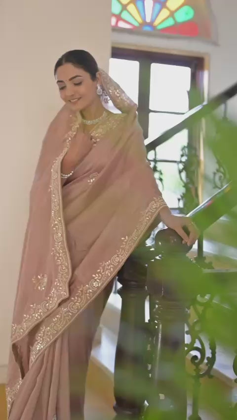 Delicately adorned with intricate thread embroidery along the border and scattered floral motifs, this saree adds just the right touch of shimmer and refinement. Paired with a complementing beige blouse, it’s an ideal ensemble for receptions, festive gatherings, or formal events.
