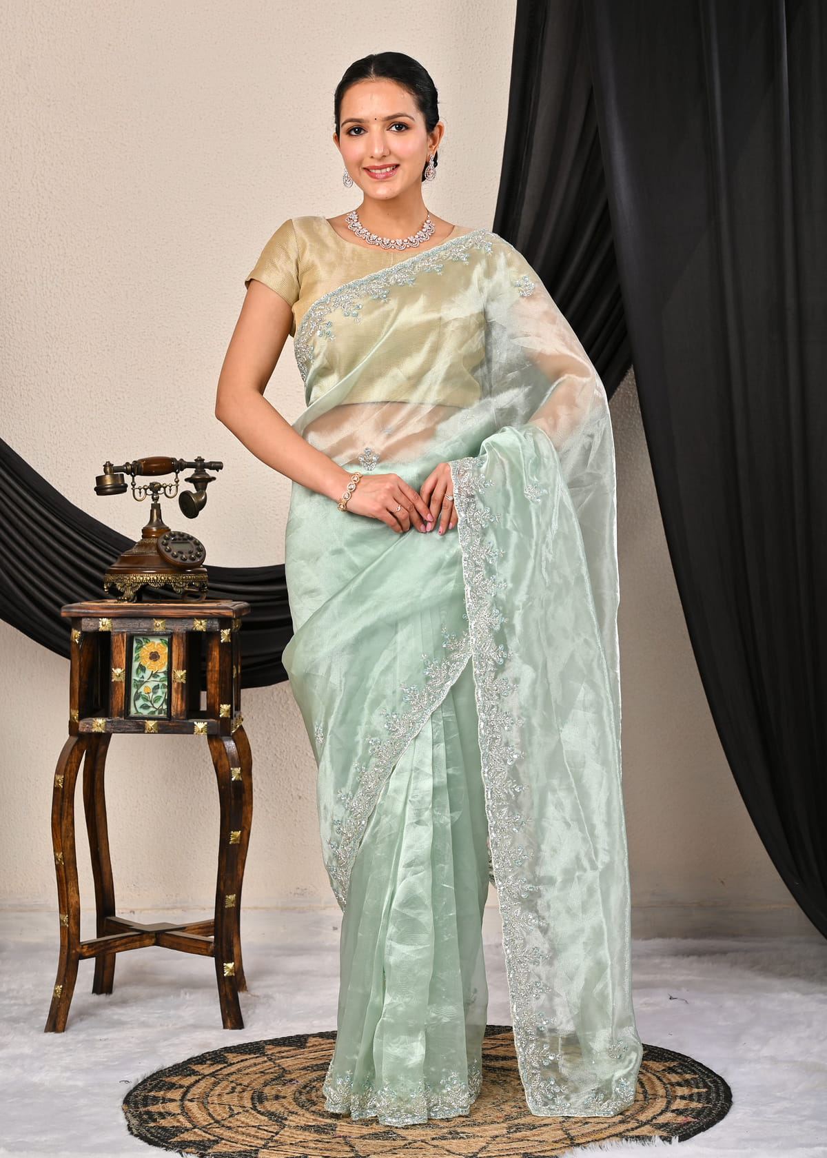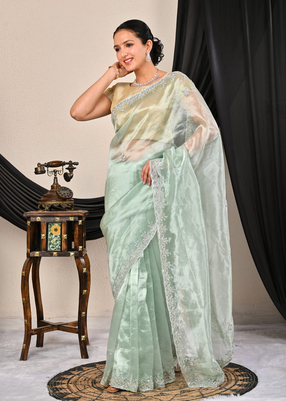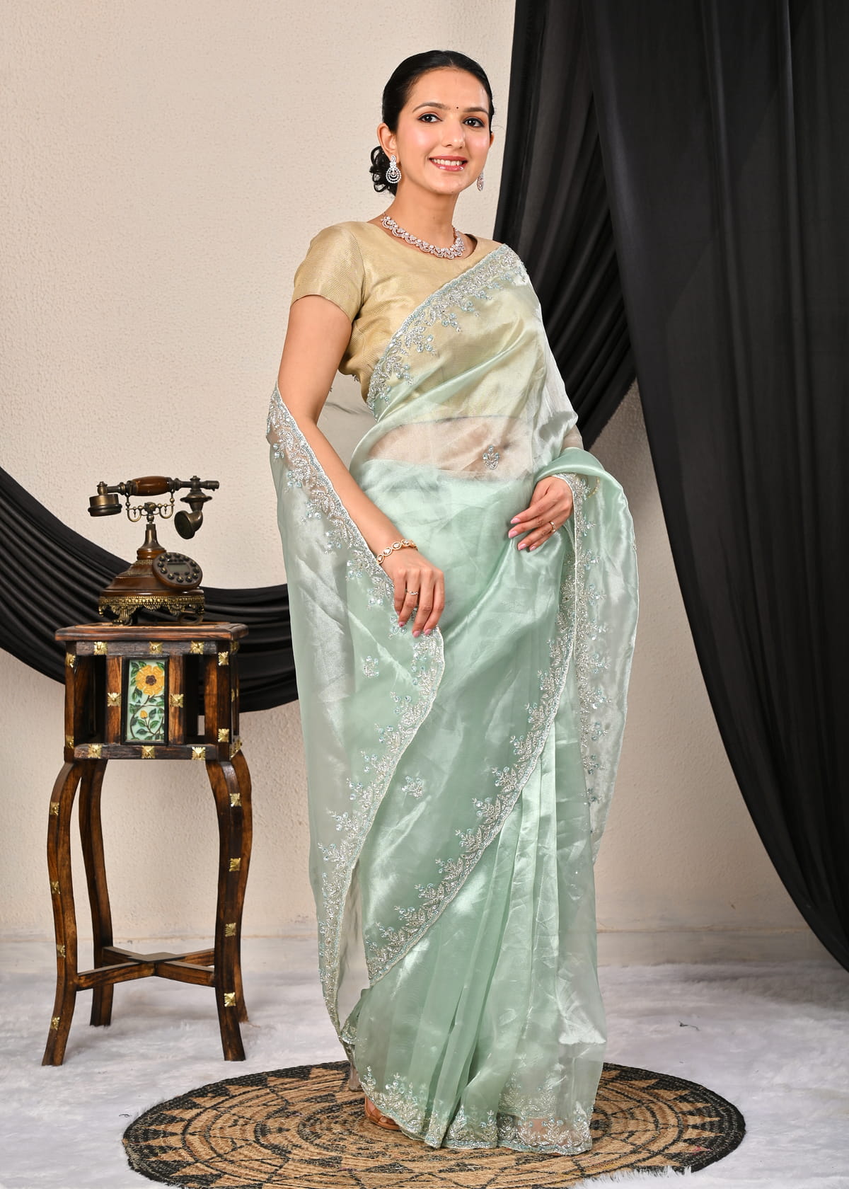 Ethereal and elegant, this Tissue Saree with Cutdana Work is a timeless masterpiece that embodies sheer grace. The delicate pastel mint green hue exudes serenity, making it an exquisite choice for those who adore understated luxury.