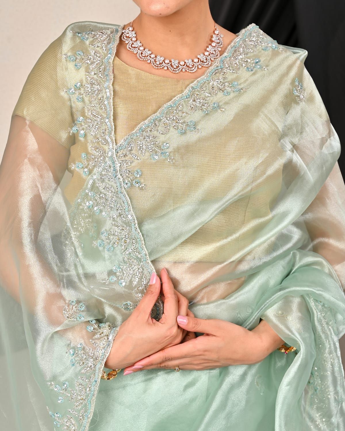 Crafted from feather-light tissue fabric, this saree drapes effortlessly, creating a fluid silhouette that enhances your natural elegance. The subtle shimmer of the fabric is complemented by intricate handcrafted cutdana embroidery, adorning the border and pallu with a mesmerizing sparkle. Delicate floral motifs along the edges add a romantic touch, making this saree perfect for weddings, soirées, and festive occasions.