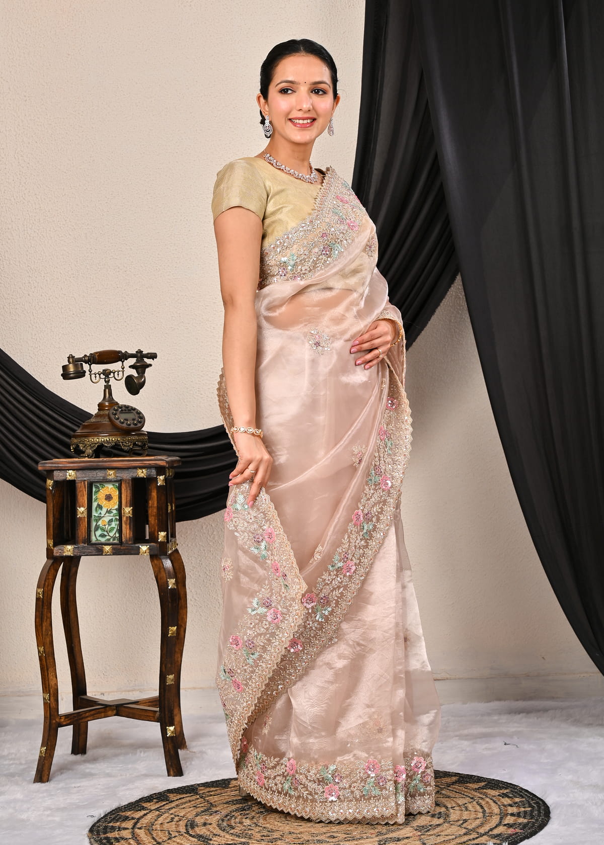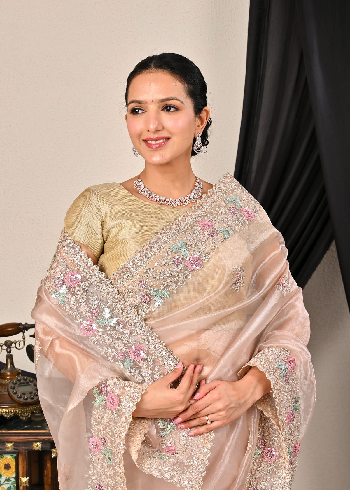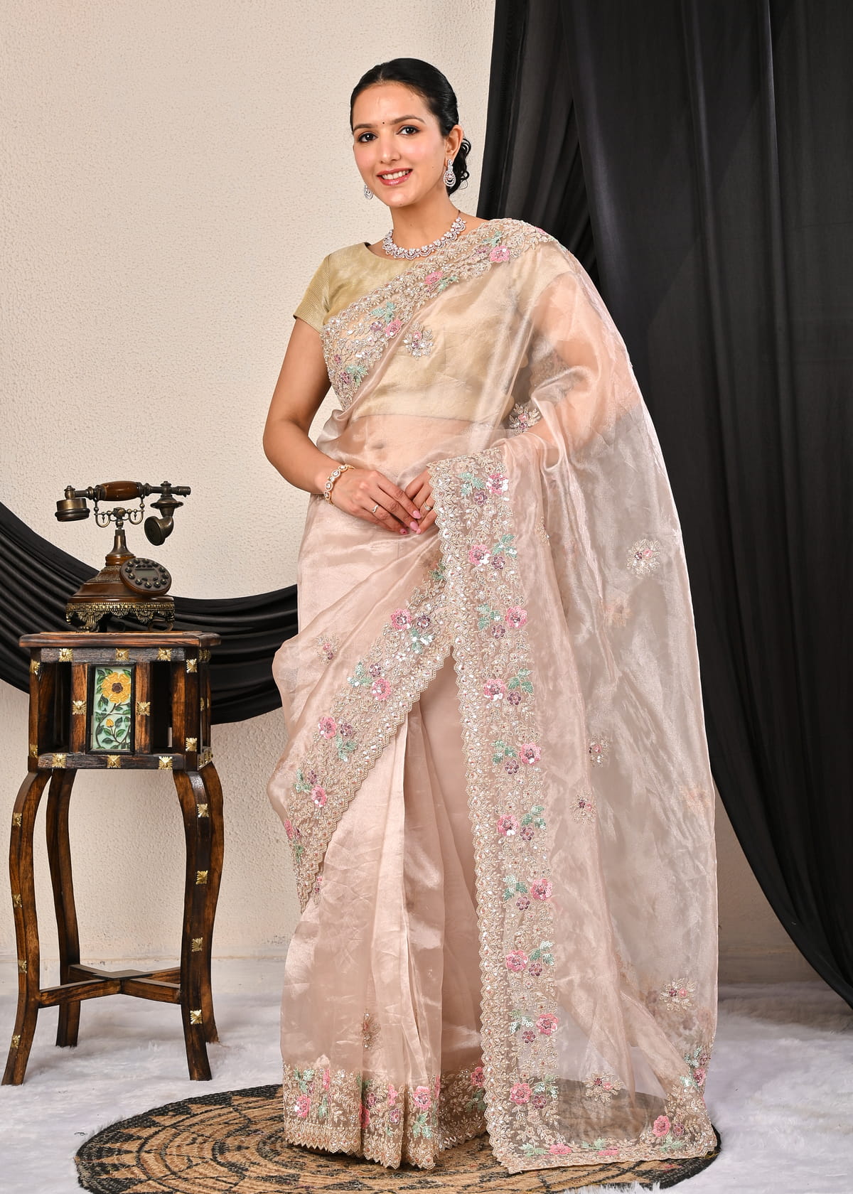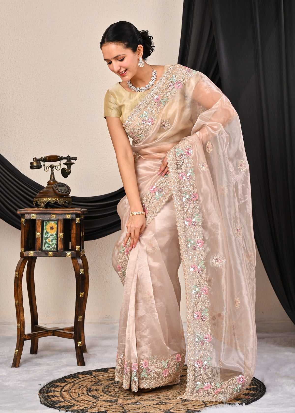 Its lightweight texture and sheer elegance offer a modern yet traditional appeal, ensuring effortless draping with a touch of royalty. Pair it with diamond or pearl jewelry for an enchanting look that speaks of poise and sophistication.