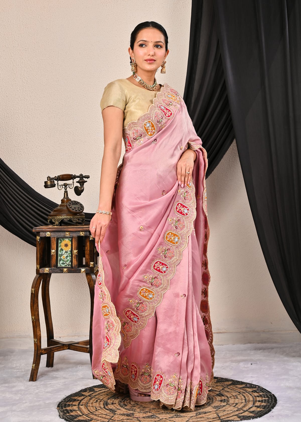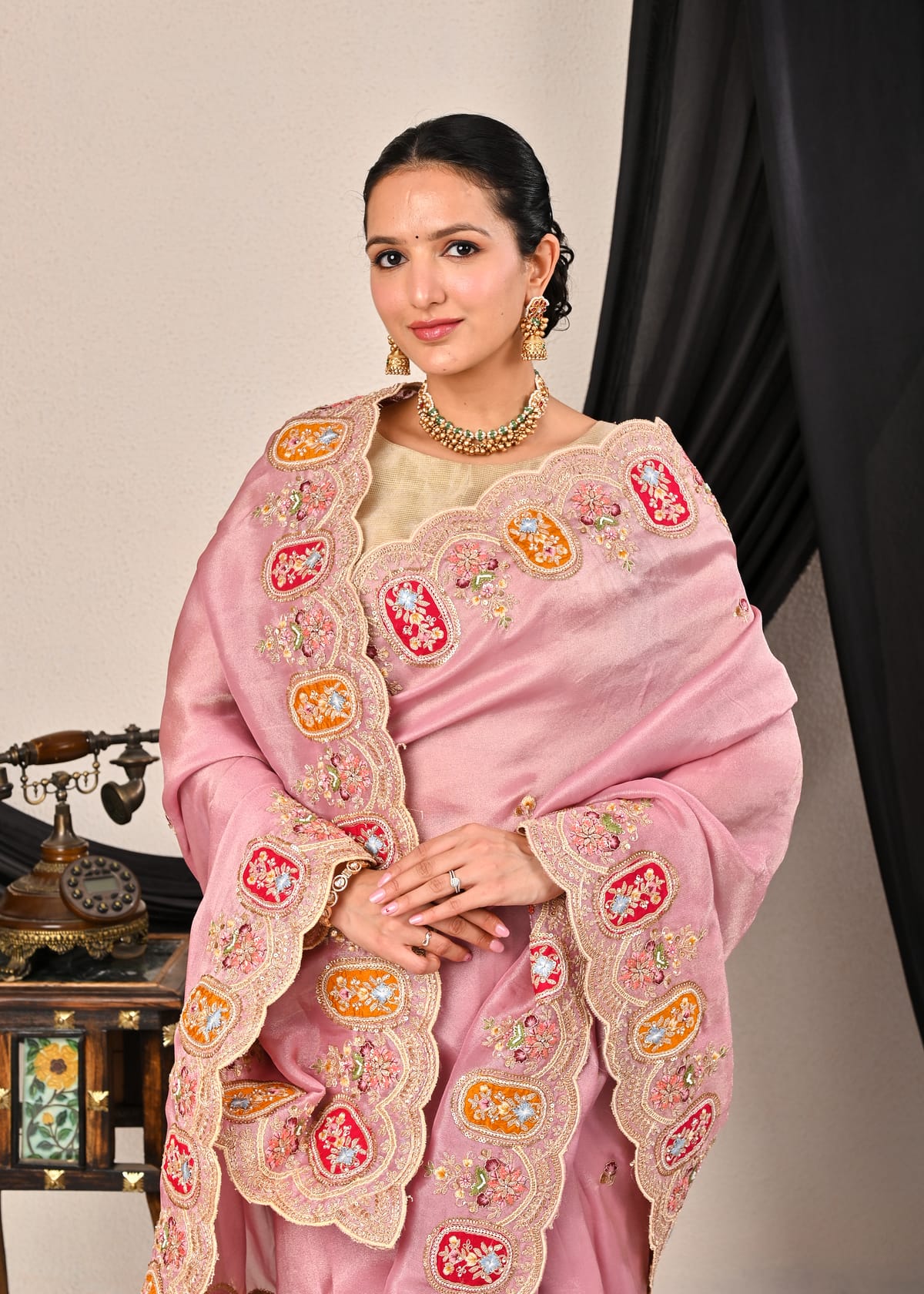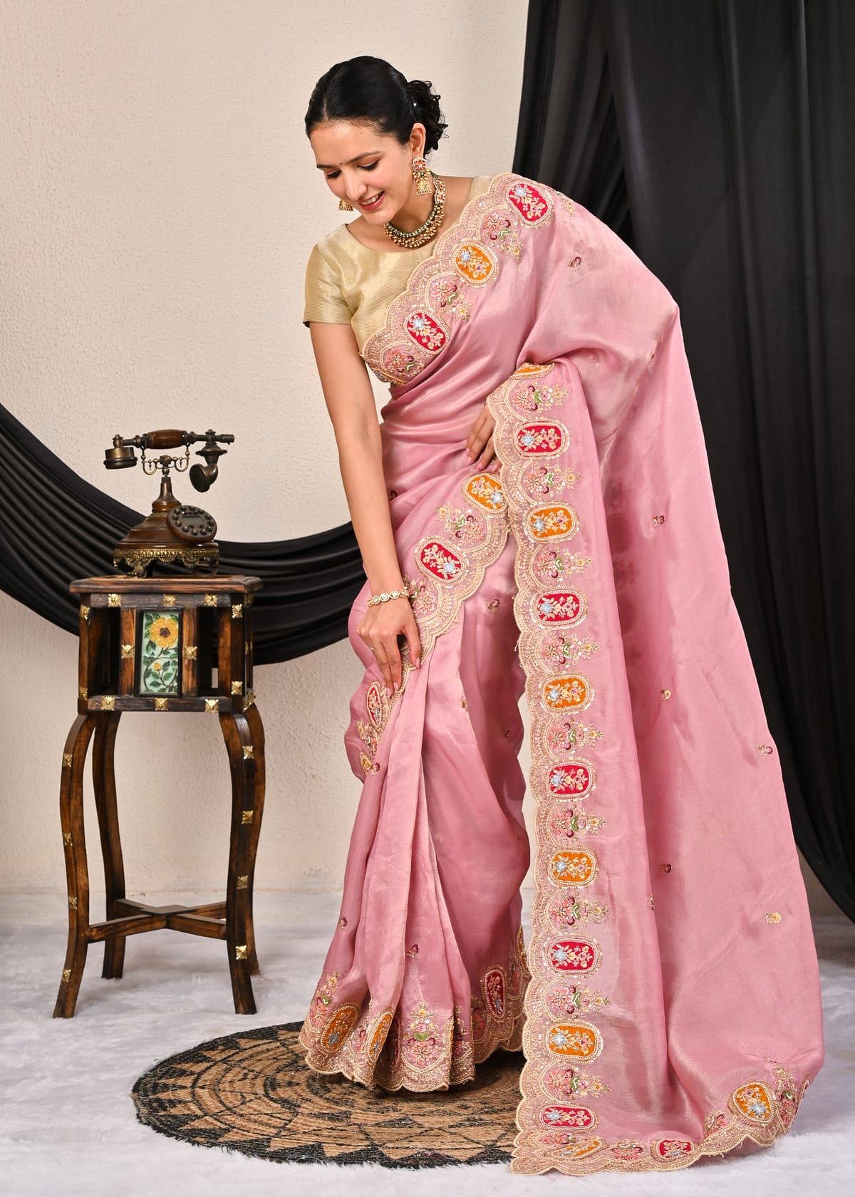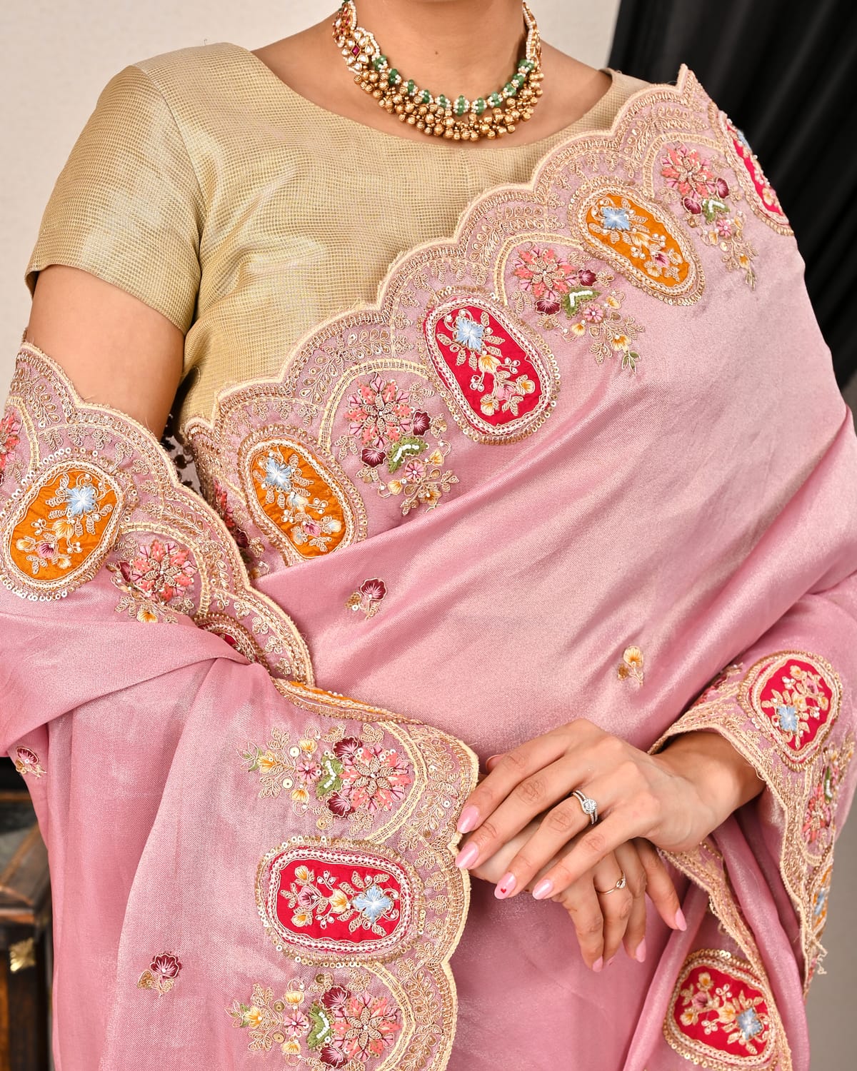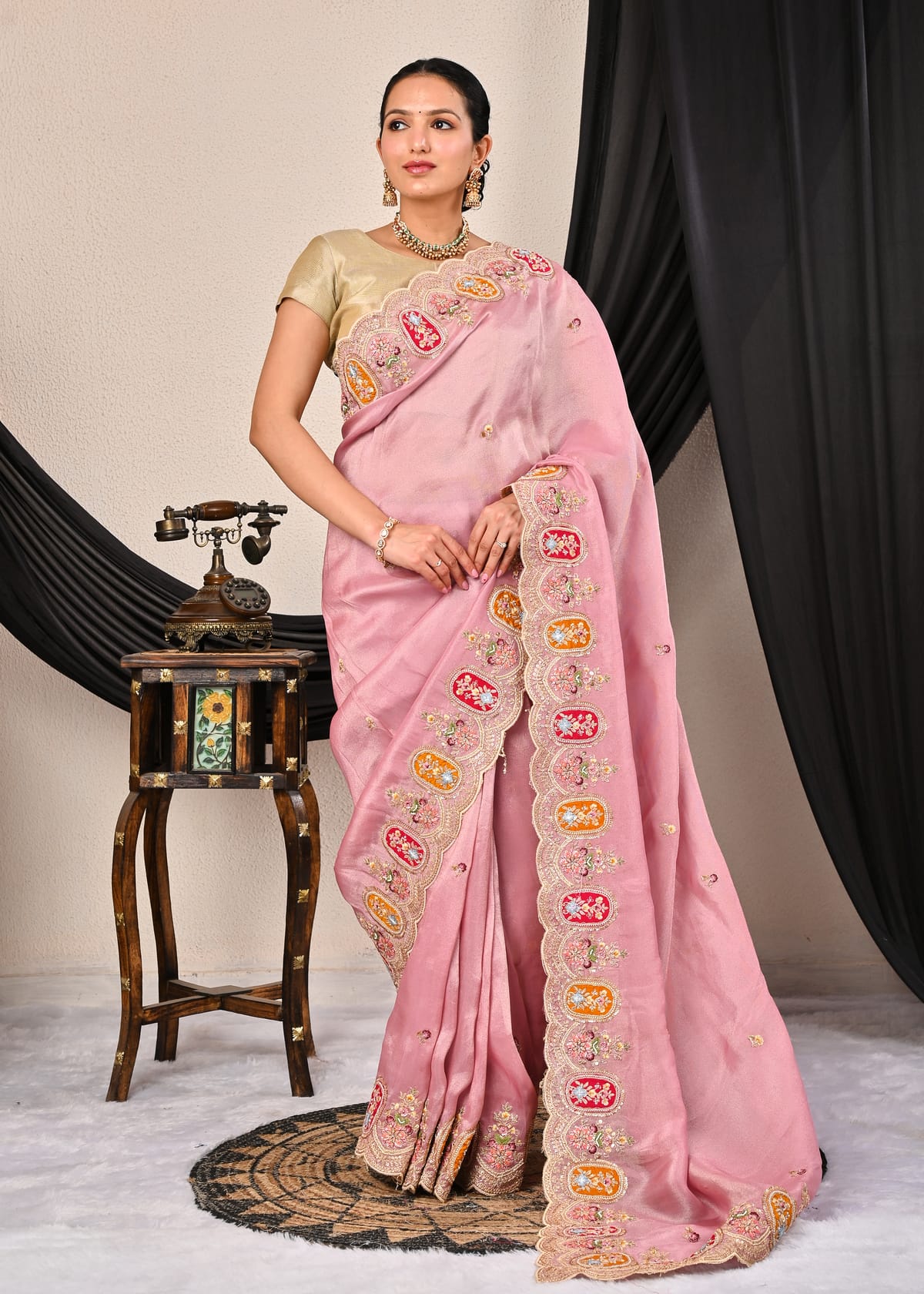 This exquisite tissue saree is a true work of art, embodying grace, tradition, and elegance. Rendered in a soft, blush pink hue, the fabric has a delicate sheen that adds an ethereal charm to its drape. The highlight of this masterpiece is its elaborate scalloped border, adorned with intricate embroidery, floral motifs, and shimmering sequin detailing.