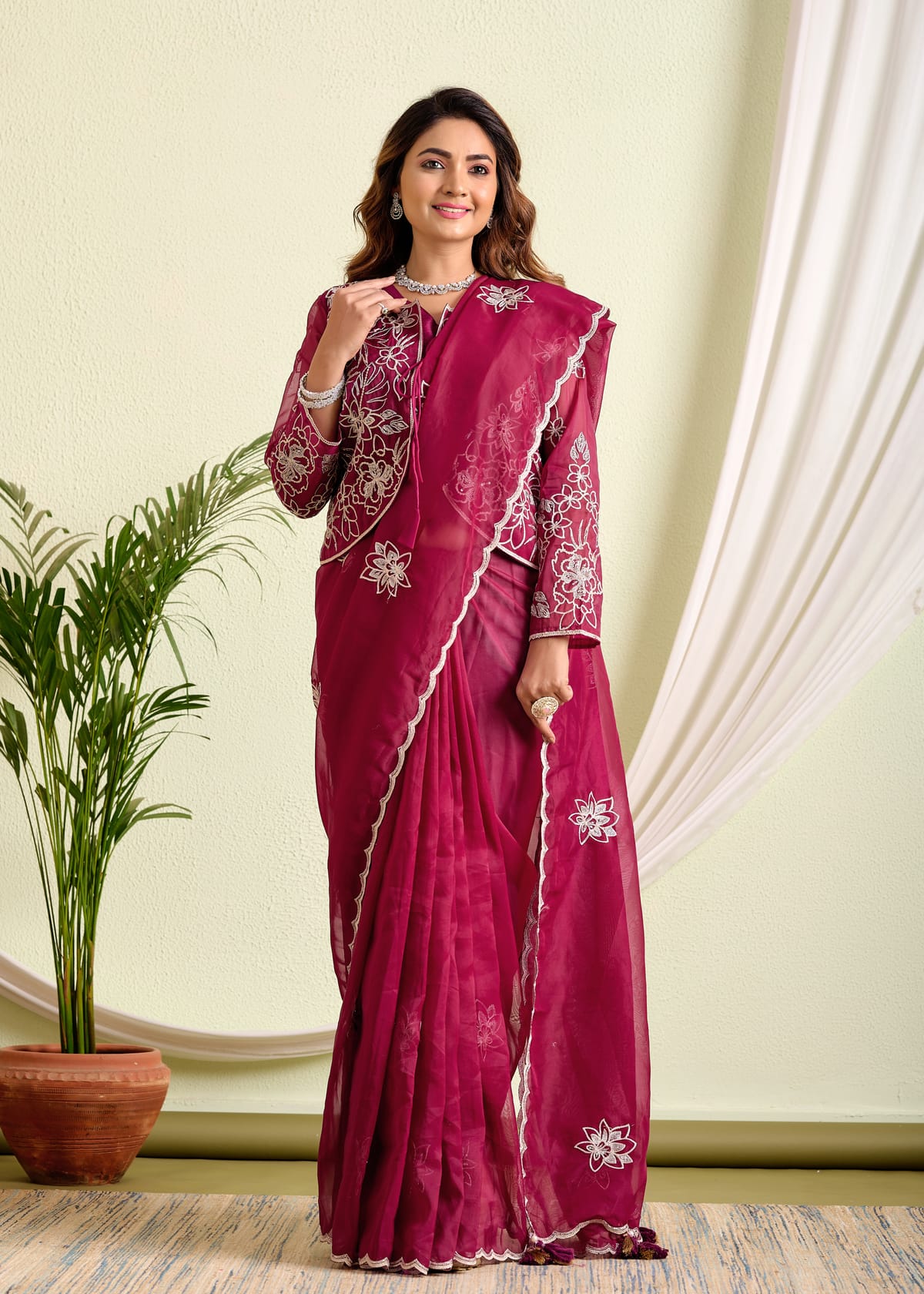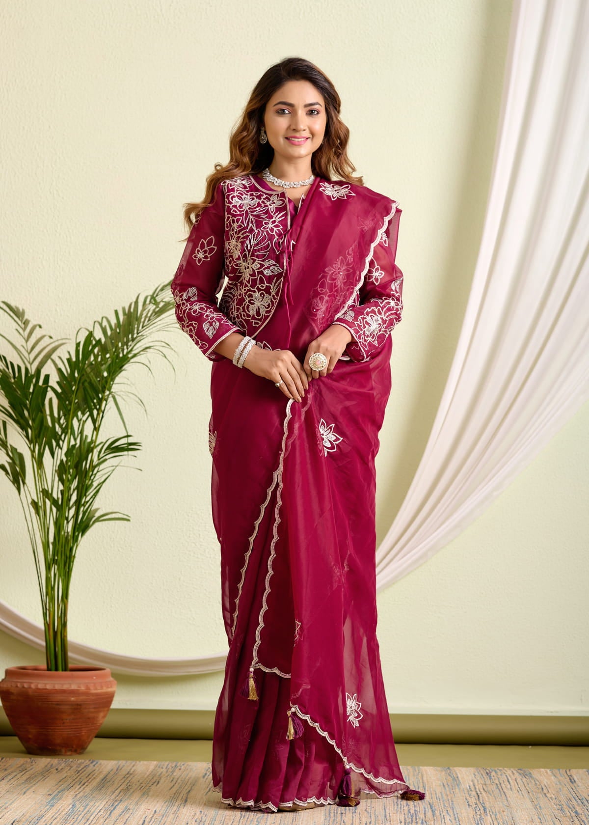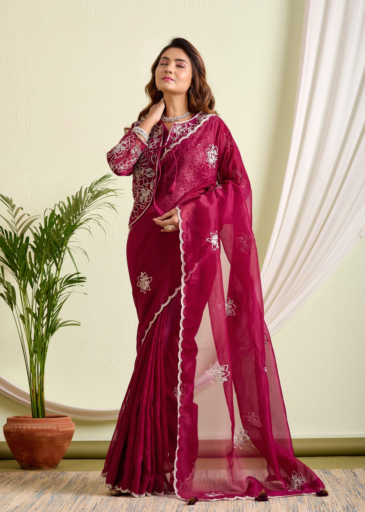 Step into elegance with this enchanting Wine Organza Saree, designed for the modern woman who appreciates timeless beauty. The sheer organza fabric drapes effortlessly, creating a light and luxurious silhouette that's perfect for both day and evening occasions.