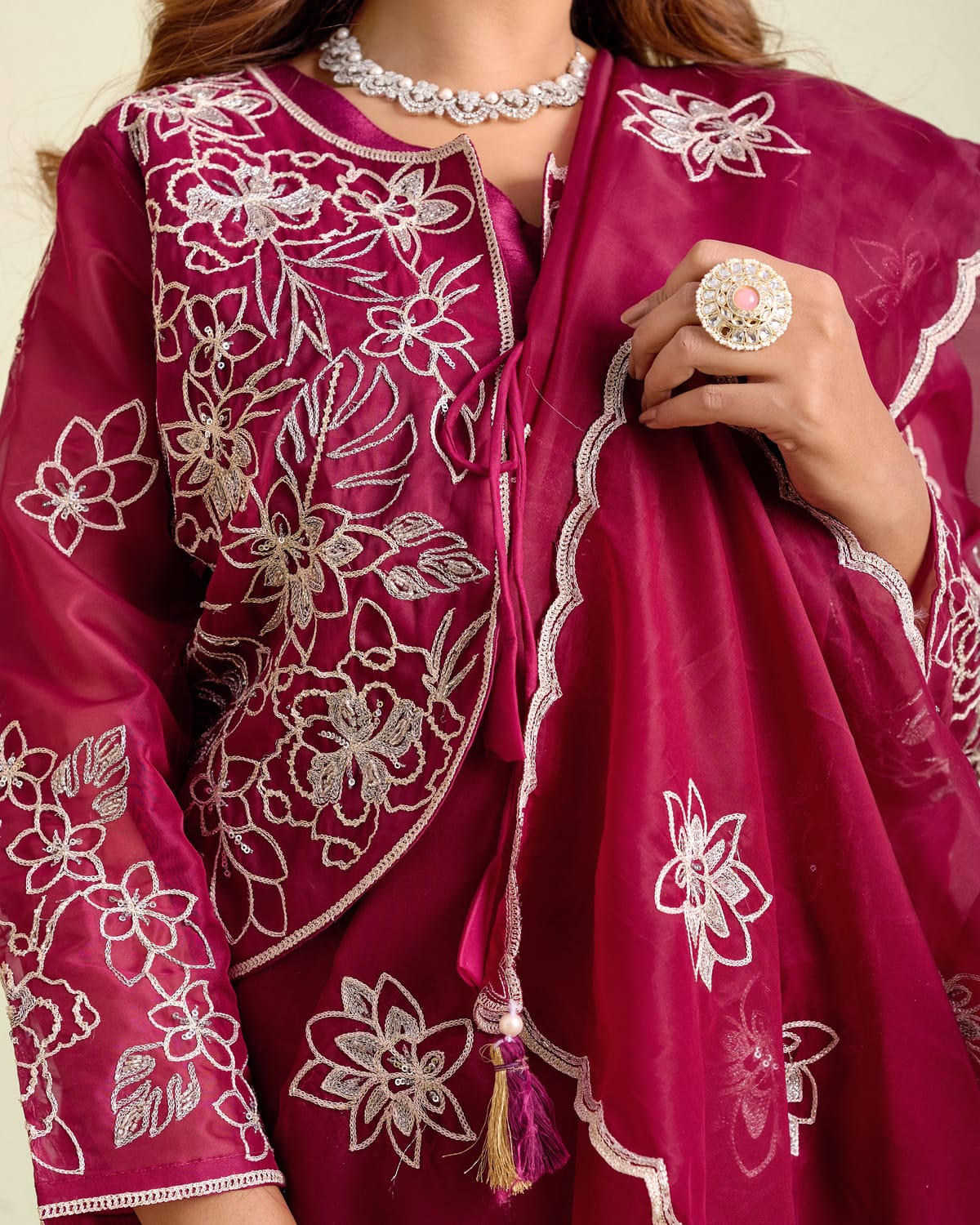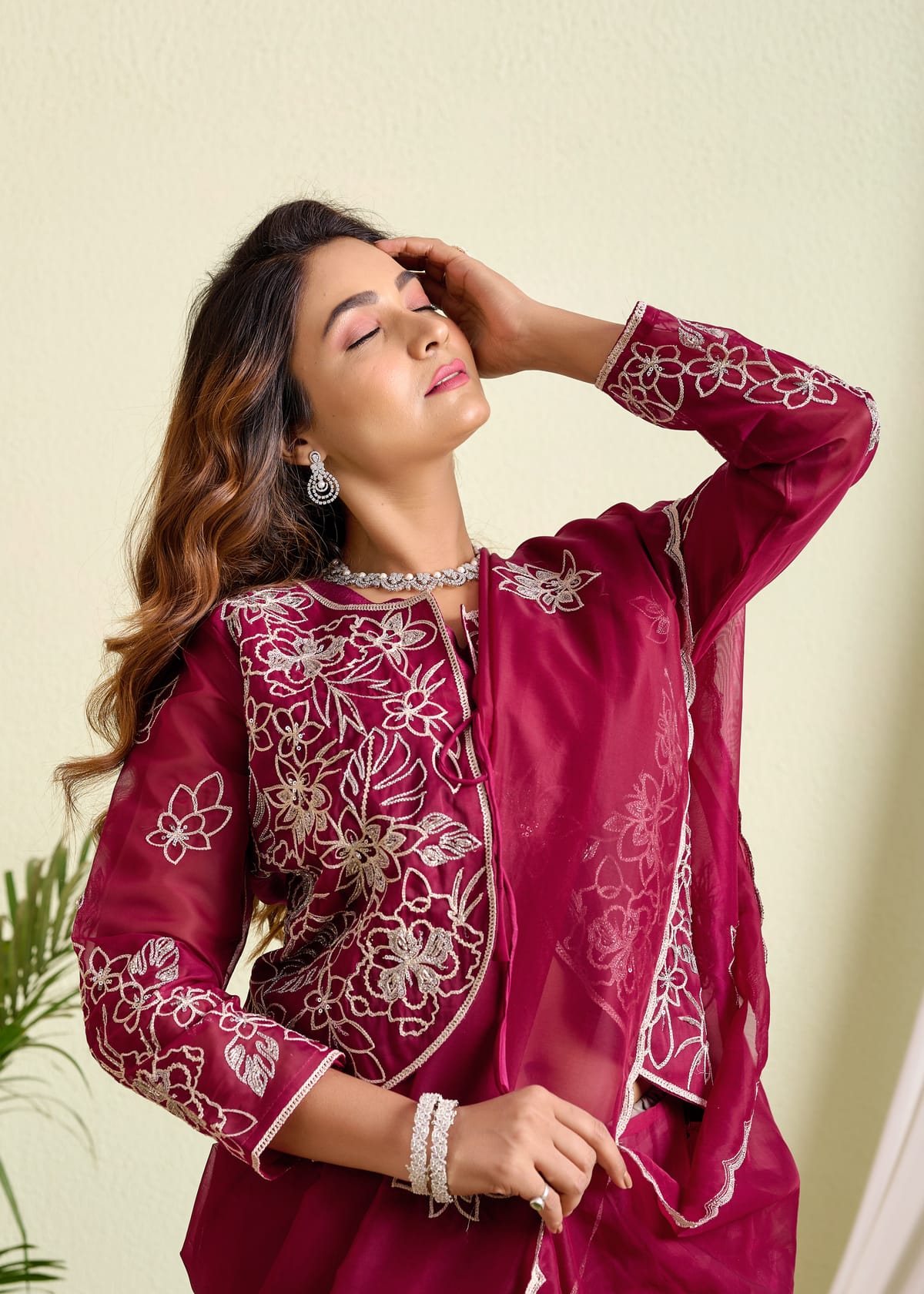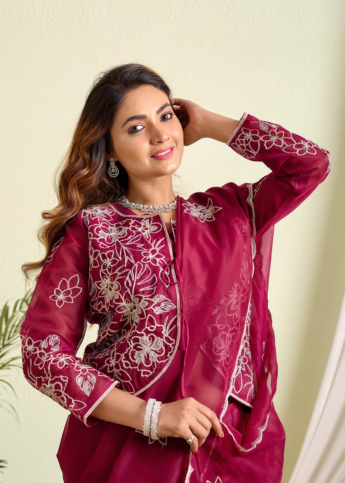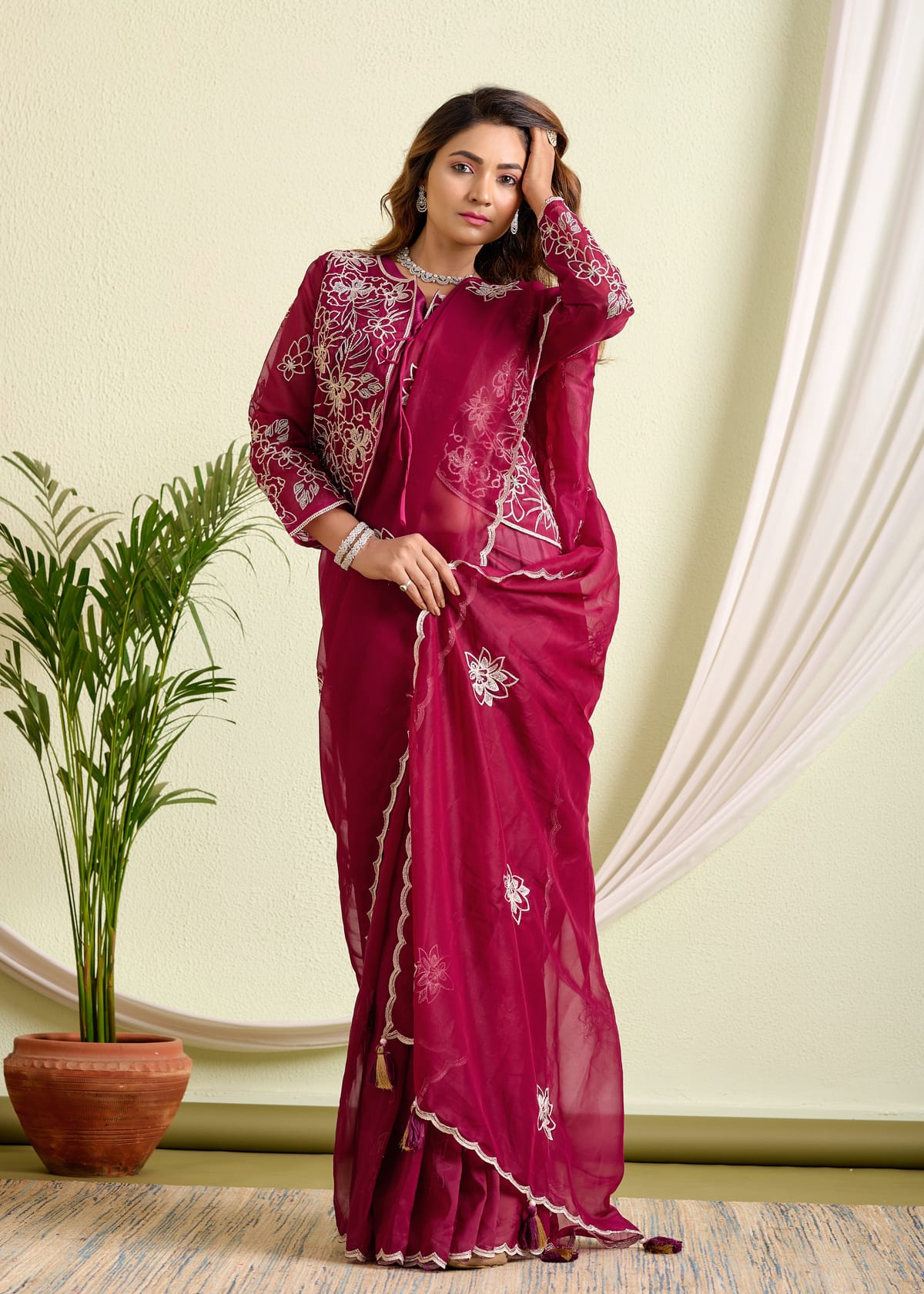 Step into elegance with this enchanting Wine Organza Saree, designed for the modern woman who appreciates timeless beauty. The sheer organza fabric drapes effortlessly, creating a light and luxurious silhouette that's perfect for both day and evening occasions.